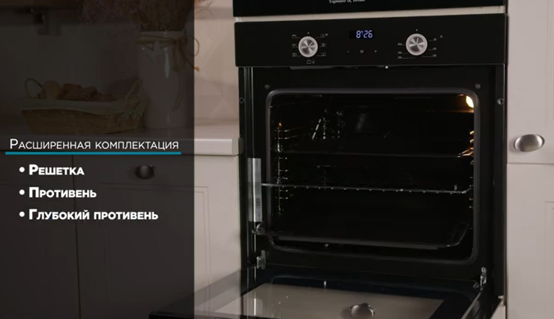 В комплекте идут телескопические направляющие неполного выдвижения, решетка с ограничителем, эмалированный и стеклянный противни.