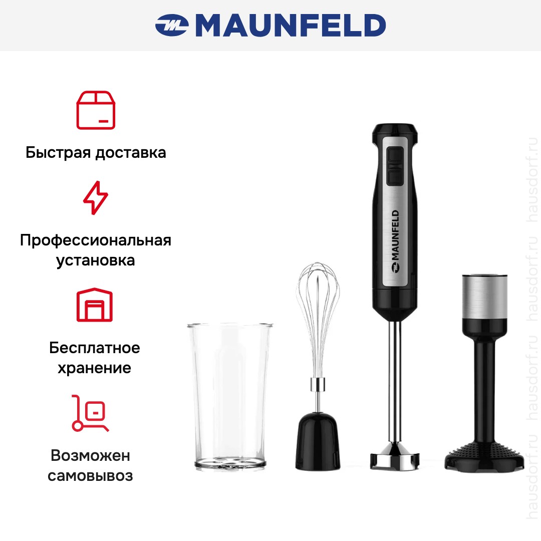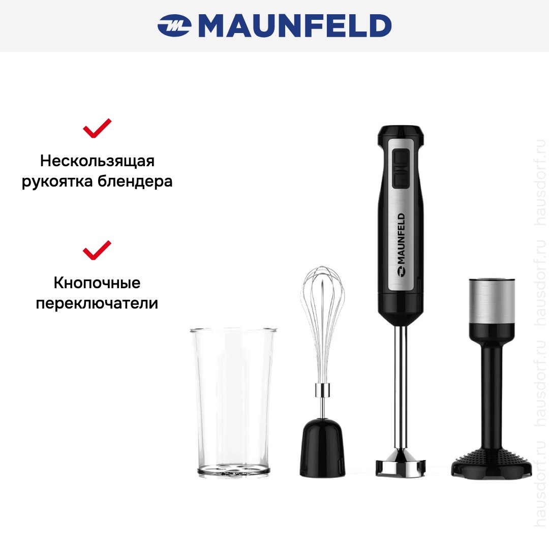 Погружной блендер Maunfeld позволяет готовить смузи, коктейли, смешивать соусы и заправки и многое другое. Такая конструкция требует вашего участия — нужно держать рукоятку с насадкой и контролировать направление движения. Плюс в том, что можно использовать ее прямо в кастрюле, когда готовите, например, суп-пюре. Корпус сделан в основном из пластика, что уменьшает вес прибора. Он может как влиться в общую гамму интерьера, так и стать ярким акцентом; доминирующий цвет — черный.