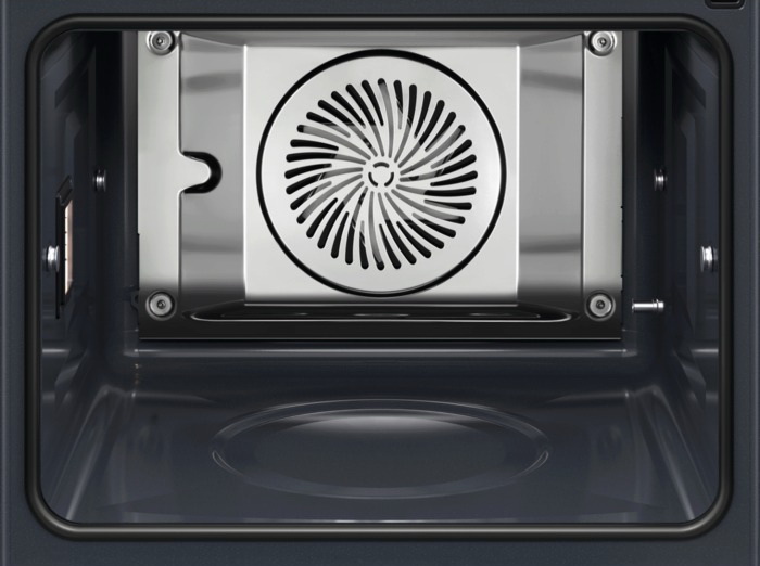 Воздух нагревается с помощью кольцевого нагревательного элемента, а затем равномерно распределяется по всему объему благодаря работе вентилятора. Блюда в этом режиме готовятся на одном уровне — как правило, среднем — для лучшего пропекания со всех сторон. Еще одно преимущество этого режима — использование достаточно низких температур. Его особенности позволяют устанавливать температуру на 20-30 градусов ниже, чем при традиционном нагрева: оптимальный уровень температуры в этом режиме — около 180 градусов.