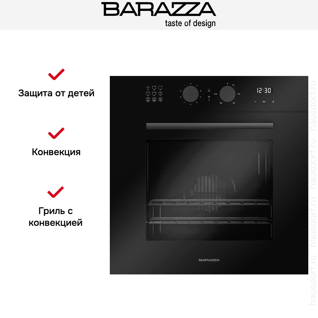 Количество режимов работы в духовом шкафу Баразза: 8. В число доступных программ входят: классический нагрев, верхний нагрев, нижний нагрев, конвекция, гриль для создания хрустящей корочки, и другие. Помимо основных программ воспользуйтесь специальными возможностями этого прибора: размораживанием продуктов, чтобы сократить время на подготовку; быстрым разогревом для ускорения работы; и другими. Тип гриля в этой модели — электрический.