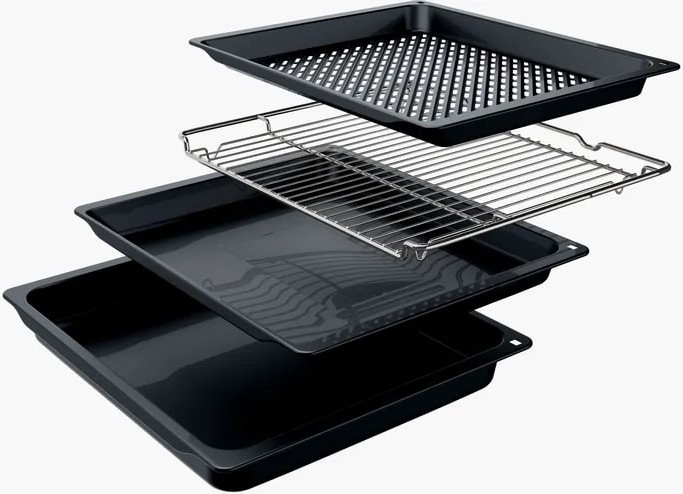 В стандартную комплектацию любого духового шкафа входят один или два противня — эмалированных или с антипригарным покрытием — и решетка. Единственный противень, как правило, имеет низкие бортики и предназначается для приготовления выпечки. Если духовка комплектуется двумя противнями, то второй отличается более высокими бортиками — его можно использовать для запекания мяса, птицы, овощных блюд. На решетке в духовке, не оснащенной грилем, обычно устанавливаются формы для запекания — стальные, керамические или стеклянные. В духовках премиум-класса количество противней может быть увеличено: к стандартному комплекту добавляются противни с перфорацией для мяса, специальные поддоны для сбора выделившегося сока.