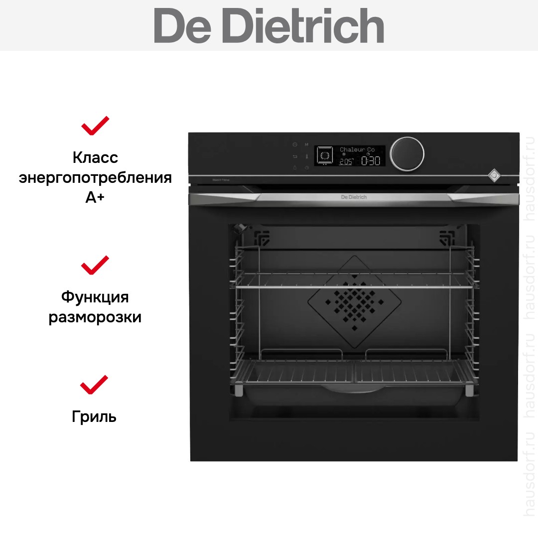 Количество режимов работы в духовом шкафу Де Дитрих: 14. В число доступных программ входят: классический нагрев, гриль для создания хрустящей корочки, сушка для овощей и фруктов, и другие. Помимо основных программ воспользуйтесь специальными возможностями этого прибора: размораживанием продуктов, чтобы сократить время на подготовку; опцией автоматического поднятия теста; и другими. Тип гриля в этой модели — электрический.