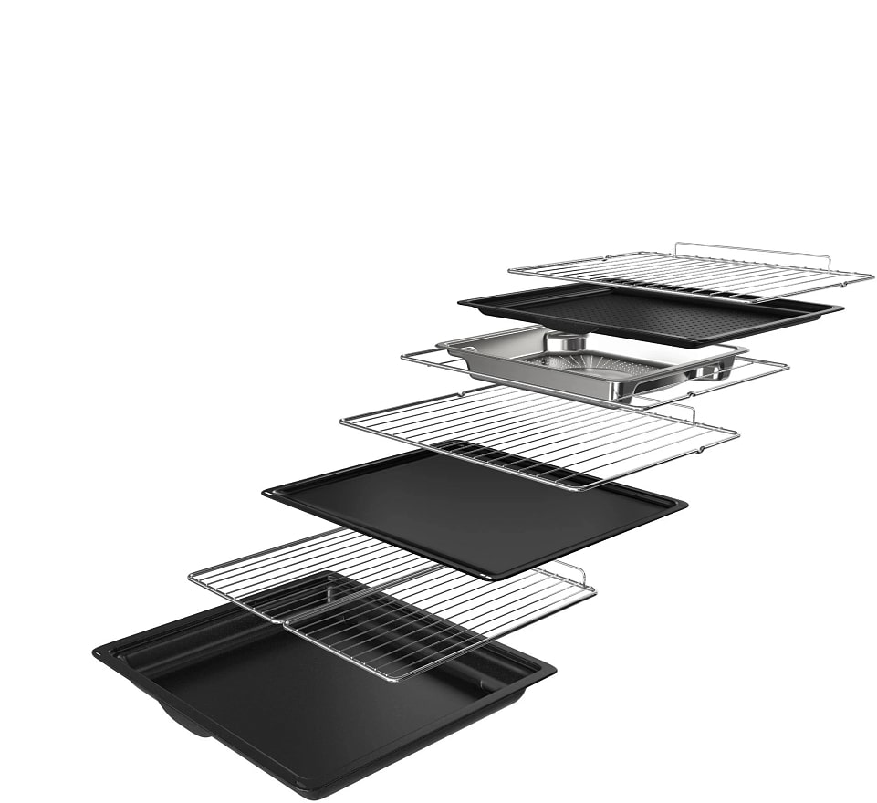 В стандартную комплектацию любого духового шкафа входят один или два противня — эмалированных или с антипригарным покрытием — и решетка. Единственный противень, как правило, имеет низкие бортики и предназначается для приготовления выпечки. Если духовка комплектуется двумя противнями, то второй отличается более высокими бортиками — его можно использовать для запекания мяса, птицы, овощных блюд. На решетке в духовке, не оснащенной грилем, обычно устанавливаются формы для запекания — стальные, керамические или стеклянные. В духовках премиум-класса количество противней может быть увеличено: к стандартному комплекту добавляются противни с перфорацией для мяса, специальные поддоны для сбора выделившегося сока.