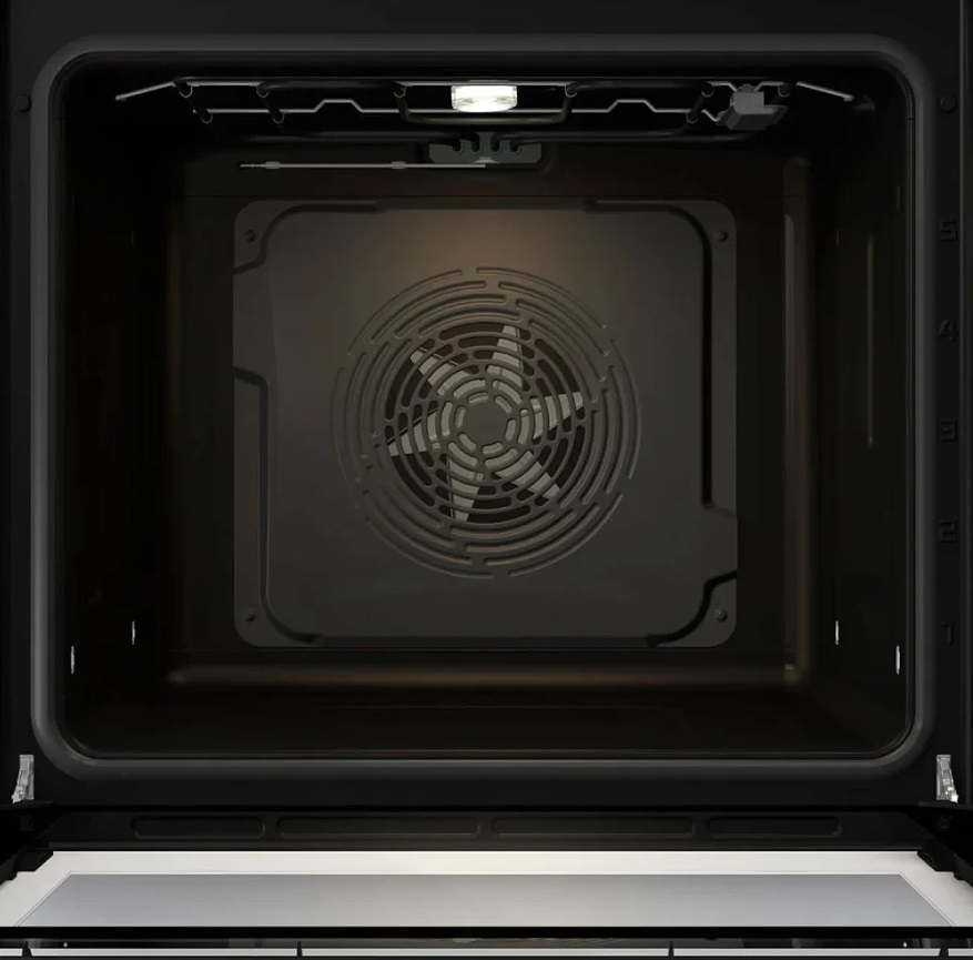 Этот трубчатый нагреватель проходит по периметру задней стенки. Внутри образованного им контура за специальной перфорированной стенкой находится мощный вентилятор. Когда воздух нагревается, вентилятор равномерно распределяет его по всему пространству камеры, так что во всех ее участках поддерживается одинаковая температура. Поскольку используется задний нагрев, потоки воздуха проникают между уровнями приготовления, что позволяет размещать в камере сразу несколько блюд без смешивания запахов, чтобы сэкономить время и снизить расход электроэнергии. При приготовлении в этом режиме блюдо не подгорит ни сверху, ни снизу, а воздействие горячего воздуха гарантирует получение румяной корочки.