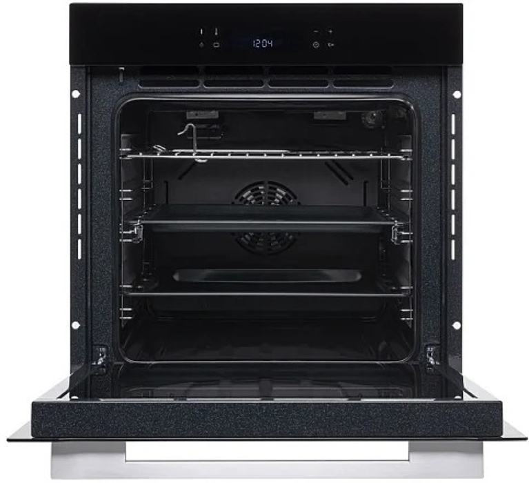 Большая камера на 73 литра оборудована пятью уровнями для установки противней. Пользователю доступна опция установки таймера. Духовой шкаф отключится автоматически, как только установленное время закончится. В комплектацию к модели входит противень и решетка.