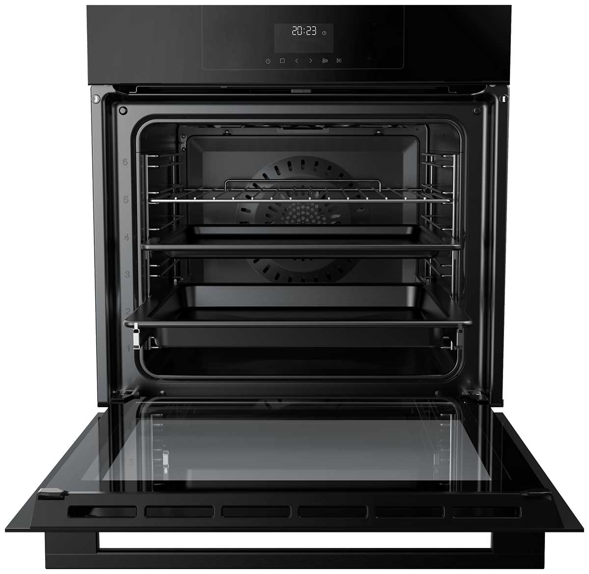 Особенности дизайна и внешней панели управления — также важный пункт при выборе духовки на кухню. В данной модели нужно обратить внимание на цвет — черное стекло, охлаждение двери, чтобы поверхность и мебель вокруг не нагревались.