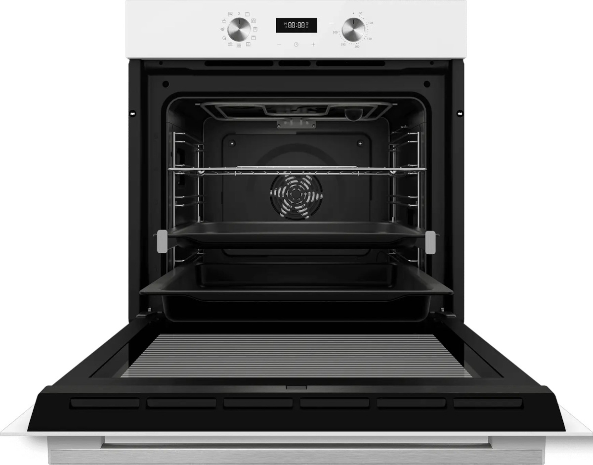 Особенности дизайна и внешней панели управления — также важный пункт при выборе духовки на кухню. В данной модели нужно обратить внимание на цвет — белый,