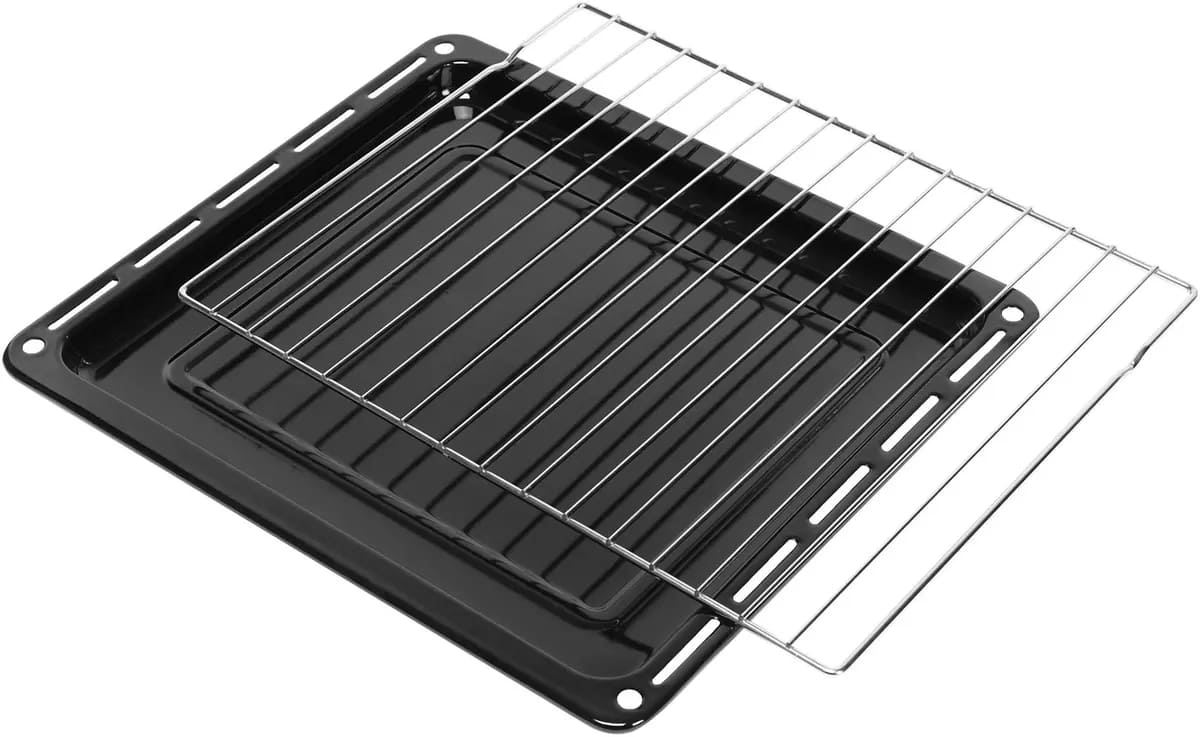 В стандартную комплектацию любого духового шкафа входят один или два противня — эмалированных или с антипригарным покрытием — и решетка. Единственный противень, как правило, имеет низкие бортики и предназначается для приготовления выпечки. Если духовка комплектуется двумя противнями, то второй отличается более высокими бортиками — его можно использовать для запекания мяса, птицы, овощных блюд. На решетке в духовке, не оснащенной грилем, обычно устанавливаются формы для запекания — стальные, керамические или стеклянные. В духовках премиум-класса количество противней может быть увеличено: к стандартному комплекту добавляются противни с перфорацией для мяса, специальные поддоны для сбора выделившегося сока.