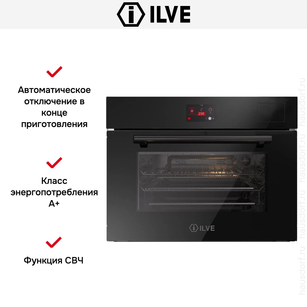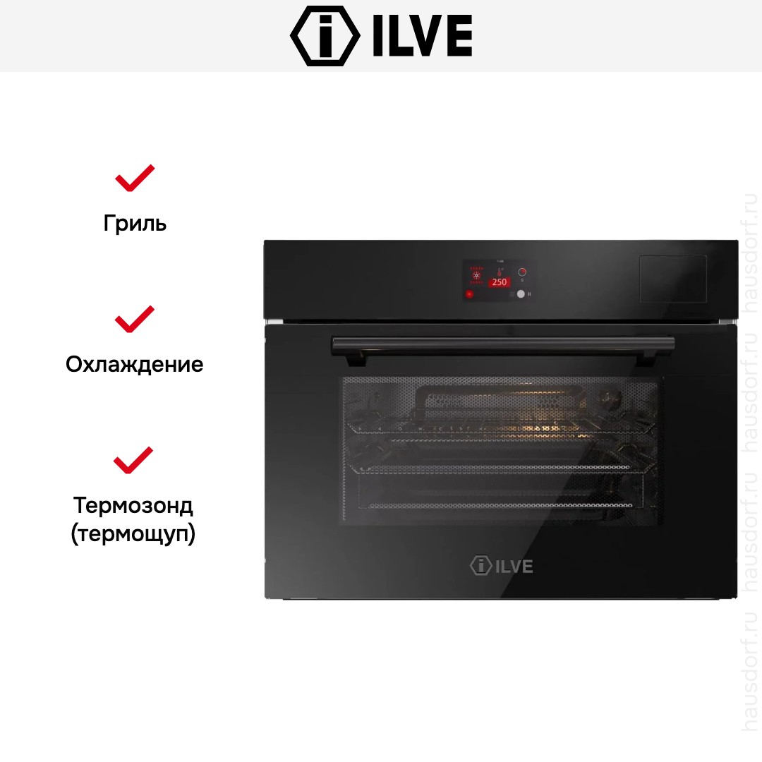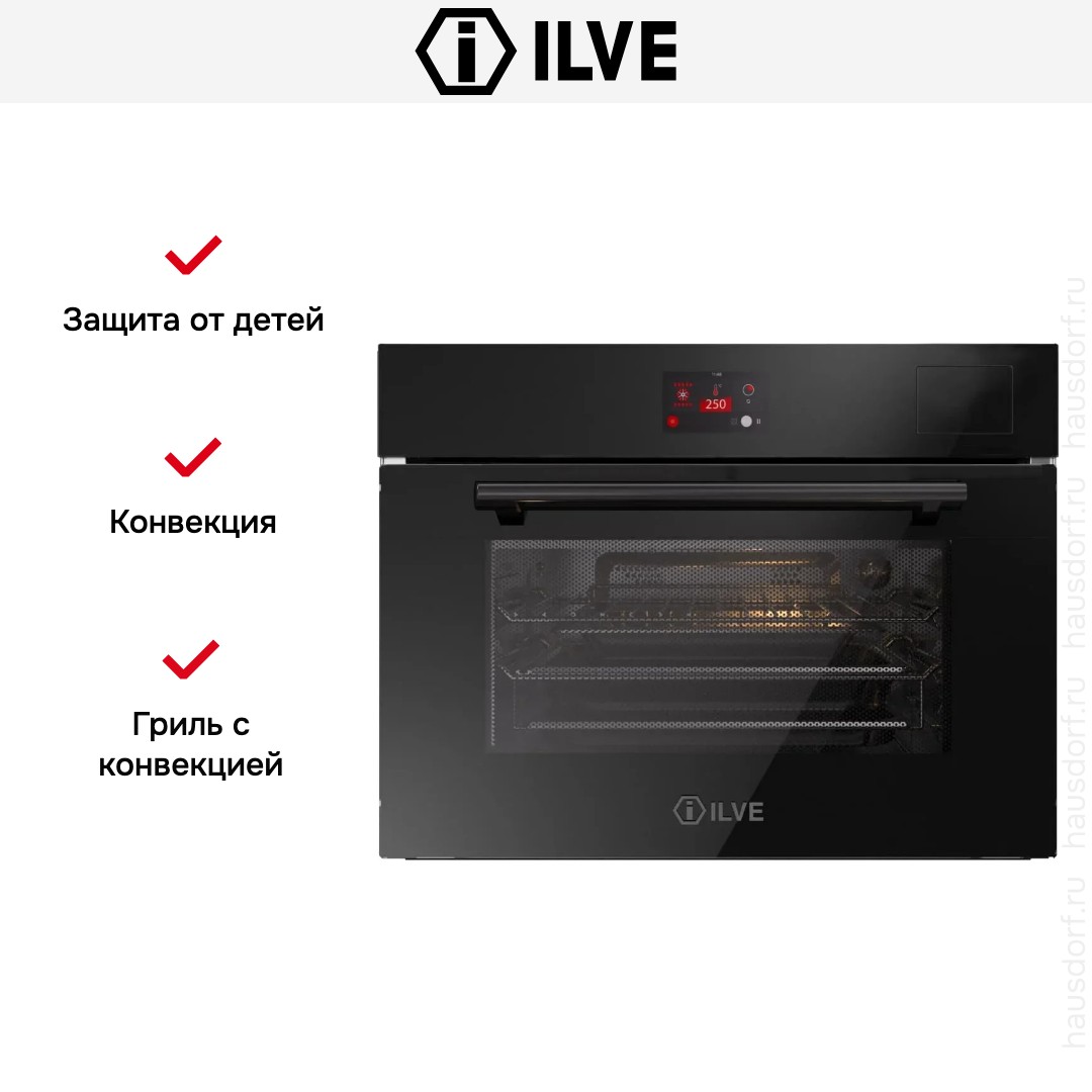 Количество режимов работы в духовом шкафу Илве: 10. В число доступных программ входят: конвекция, приготовление с помощью микроволн, дополнительное использование пара, гриль для создания хрустящей корочки, и другие. Тип гриля в этой модели — электрический.