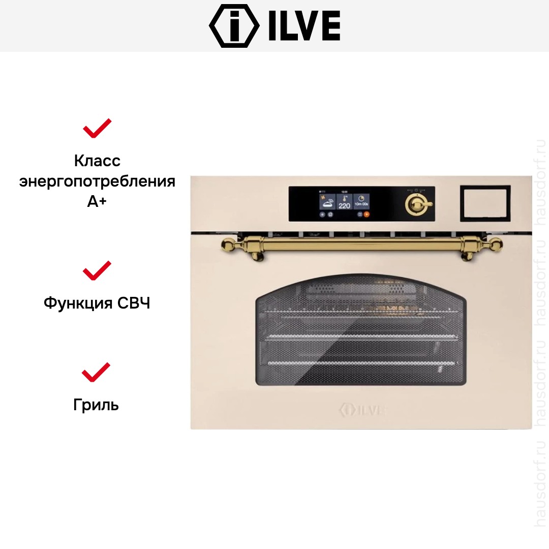 Количество режимов работы в духовом шкафу Илве: 10. В число доступных программ входят: конвекция, приготовление с помощью микроволн, дополнительное использование пара, гриль для создания хрустящей корочки, и другие. Тип гриля в этой модели — электрический.