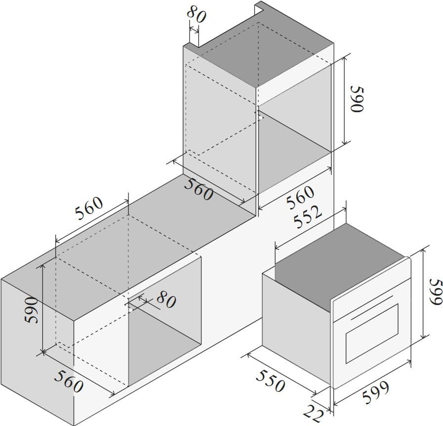 Размеры ниши для встраивания духового шкафа определяются, исходя из габаритов самого устройства. Стандартные модели обычно без труда устанавливаются в нишу шириной около 560 мм, высотой около 595 мм и глубиной примерно 550 мм. Следует помнить, что фасад устройства должен иметь большие размеры, чем величина ниши.