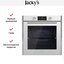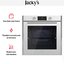 Элегантный белый корпус сочетается с лаконичной стеклянной дверцей. Откидная дверь оснащена доводчиком и тремя слоями стекла для безопасности и теплоизоляции. Внешний дизайн продуман для встраивания в кухонный гарнитур, габариты 59.5×59.5×54.7 см и рекомендуемая ниша 60×56×55 см облегчают установку. Управление аккуратно размещено на фронтальной панели, где сенсорные кнопки дополняются утапливаемыми поворотными регуляторами. Яркий дисплей и электронные часы делают выбор режима быстрым и понятным.