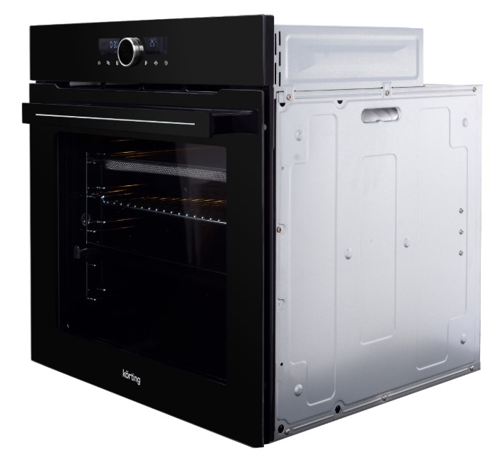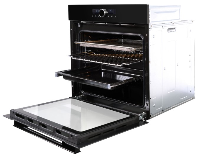 Это независимый электрический прибор, рассчитанный на встраивание в нишу размерами 59—60×56.5×58.5 см. Габариты самого корпуса 59.5×59.5×57.5 см и вес 29 кг упрощают монтаж и транспортировку. Большой объем внутренней камеры — 75 л — позволяет готовить крупные блюда и ставить сразу несколько противней на пяти уровнях, а телескопические направляющие повышают удобство работы с горячими емкостями.