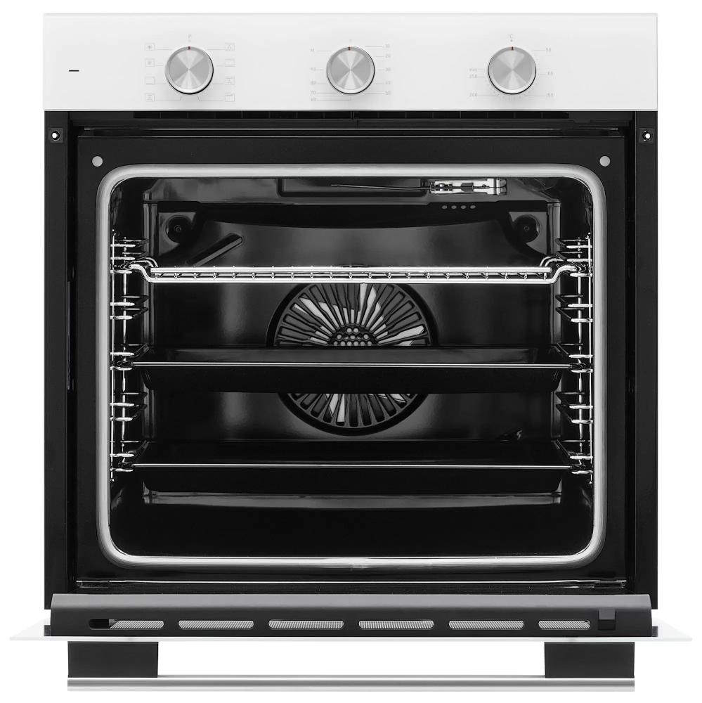 Корпус имеет компактные габариты 59.5×59.5×56.7 см и рассчитан на встраивание в нишу 60×56×55 см, что упрощает монтаж в стандартные модули. Откидывающаяся дверь с двойным стеклом обеспечивает аккуратный вид и повышенную теплоизоляцию. Внутренняя камера объёмом 78 литров позволяет готовить большие блюда и размещать противни на шести уровнях одновременно.