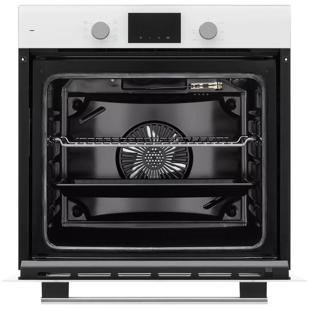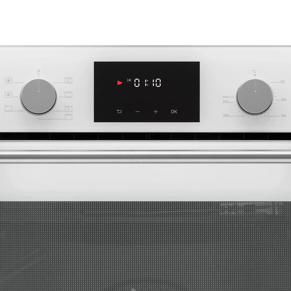 Особенности дизайна и внешней панели управления — также важный пункт при выборе духовки на кухню. В данной модели нужно обратить внимание на цвет — белый,