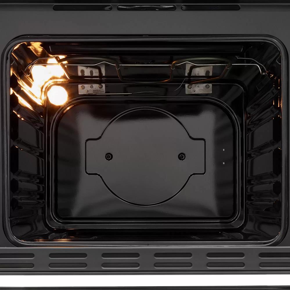 Управление представлено механическими поворотными регуляторами — это надежное и понятное решение без лишних сложностей. Таймер и регулировка температуры в диапазоне 50-260 °C помогают точно выдерживать режимы приготовления. Освещение камеры облегчает контроль готовности, а эмалевое покрытие упрощает уход: загрязнения удаляются традиционными средствами, а ровная поверхность не требует специальных технологий очистки.