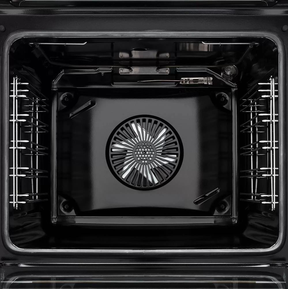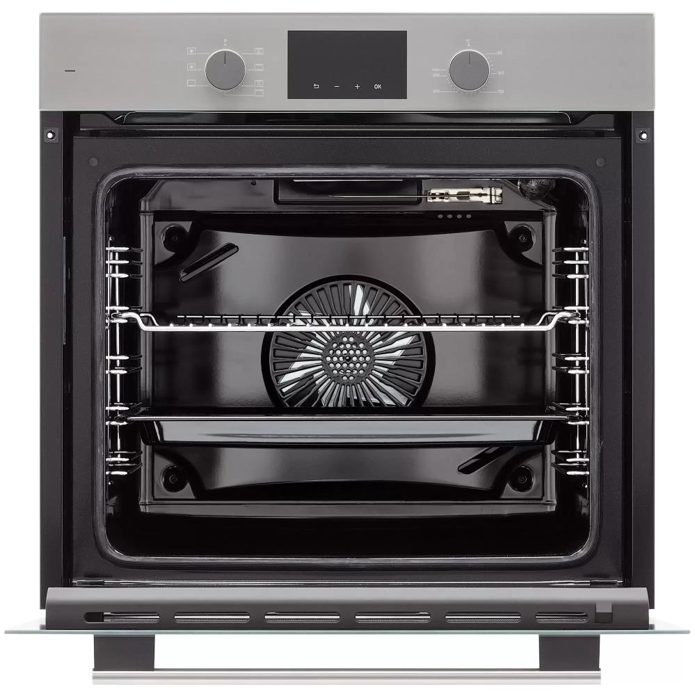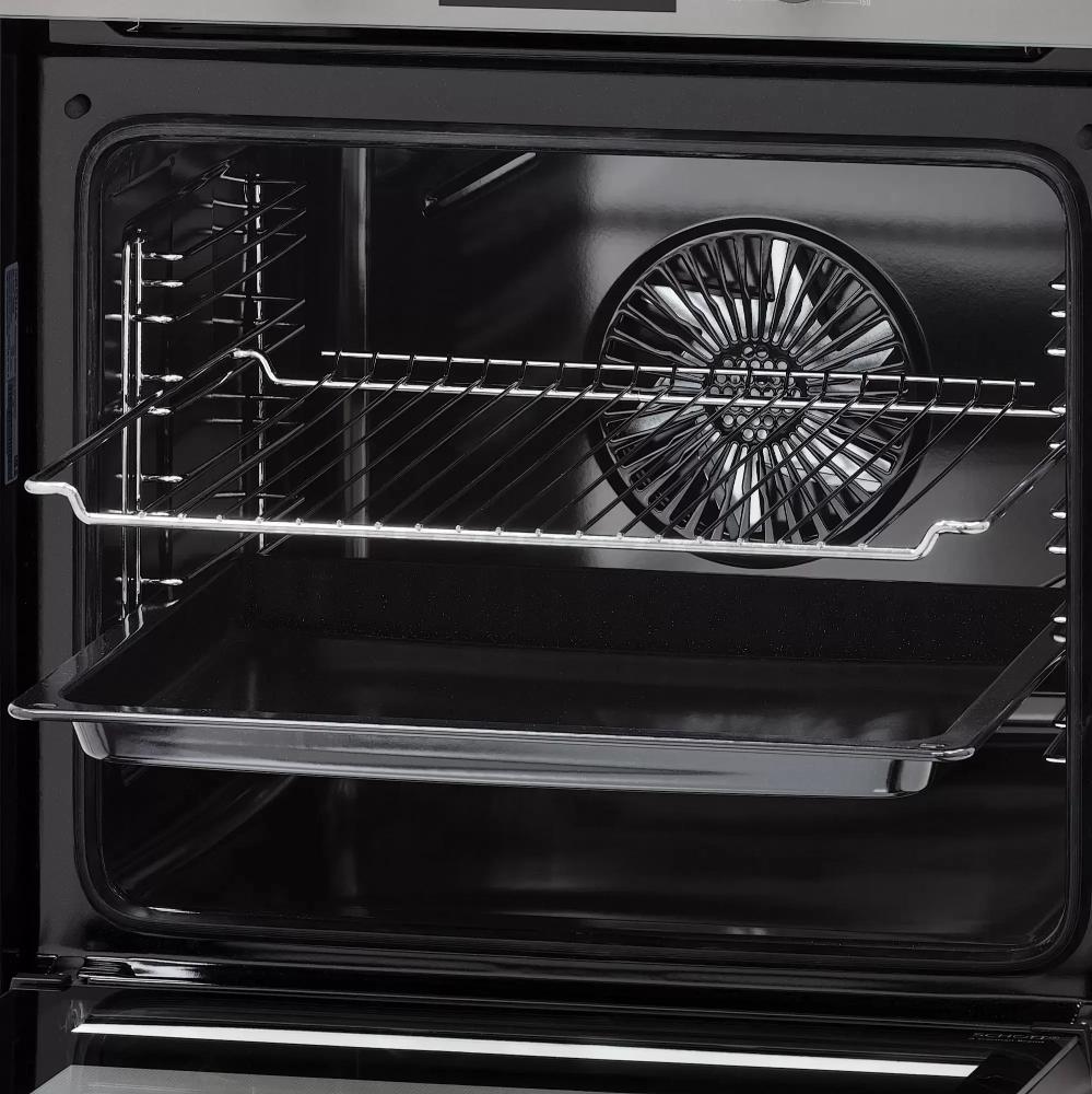 Внутренняя камера объёмом 78 литров рассчитана на большие порции и многослойное приготовление, при этом шесть направляющих и металлические рэки дают гибкость расстановки противней. Покрытие из эмали облегчает уход за камерой, хотя способ очистки традиционный и требует ручной обработки при сильных загрязнениях. Комбинация сенсорного управления и утапливаемых поворотных регуляторов делает интерфейс понятным: сенсор для точных настроек и цифровой дисплей для контроля времени, а выдвижные переключатели уменьшают риск случайного включения и упрощают очистку фасада.