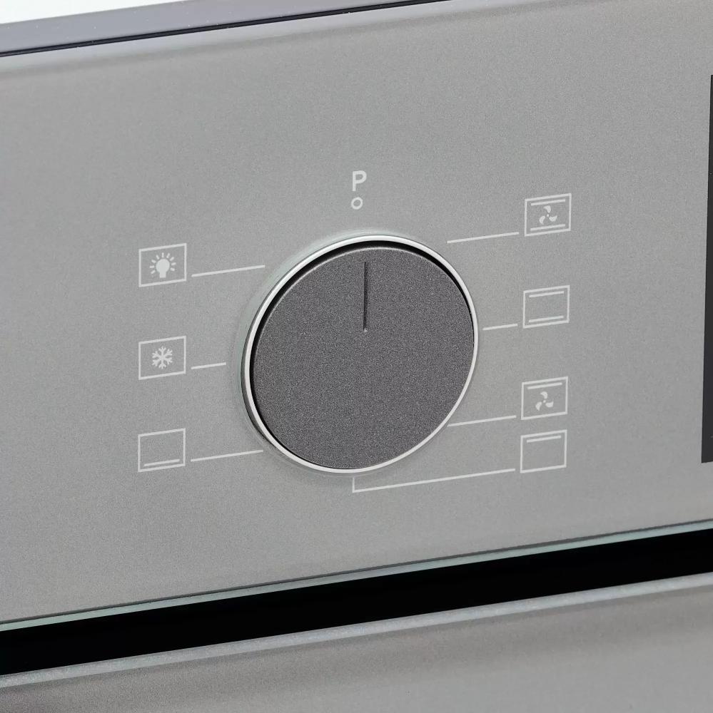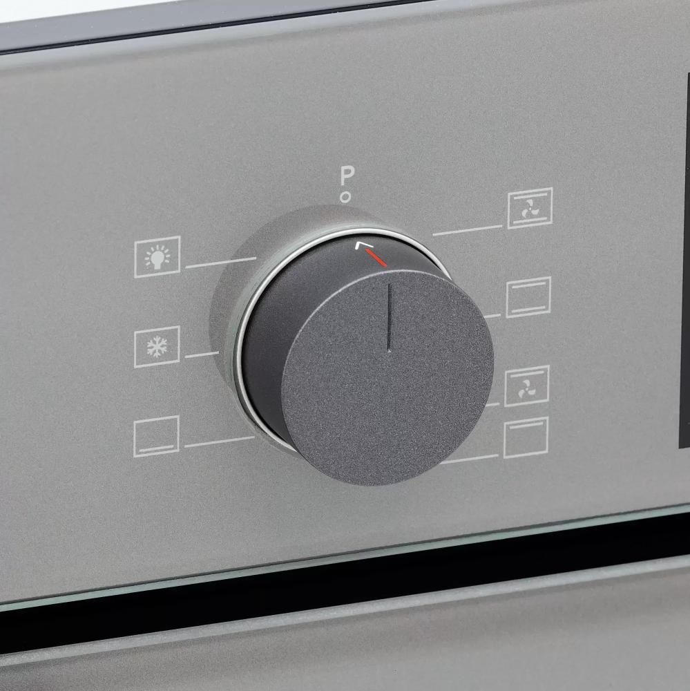 Духовой шкаф Krona Mysterium 60 GR — независимый электрический прибор, готовый вписаться в нишу стандартных размеров 60×56×55 см. Его аккуратный серый корпус и элементы из нержавеющей стали создают строгий, но спокойный облик, который легко сочетать с разными кухонными гарнитурами. Откидная дверца с двумя стеклами обеспечивает безопасный доступ к камере и снижает теплоотдачу наружу, а фурнитура из нержавеющей стали гарантирует долговечность при интенсивной эксплуатации.
