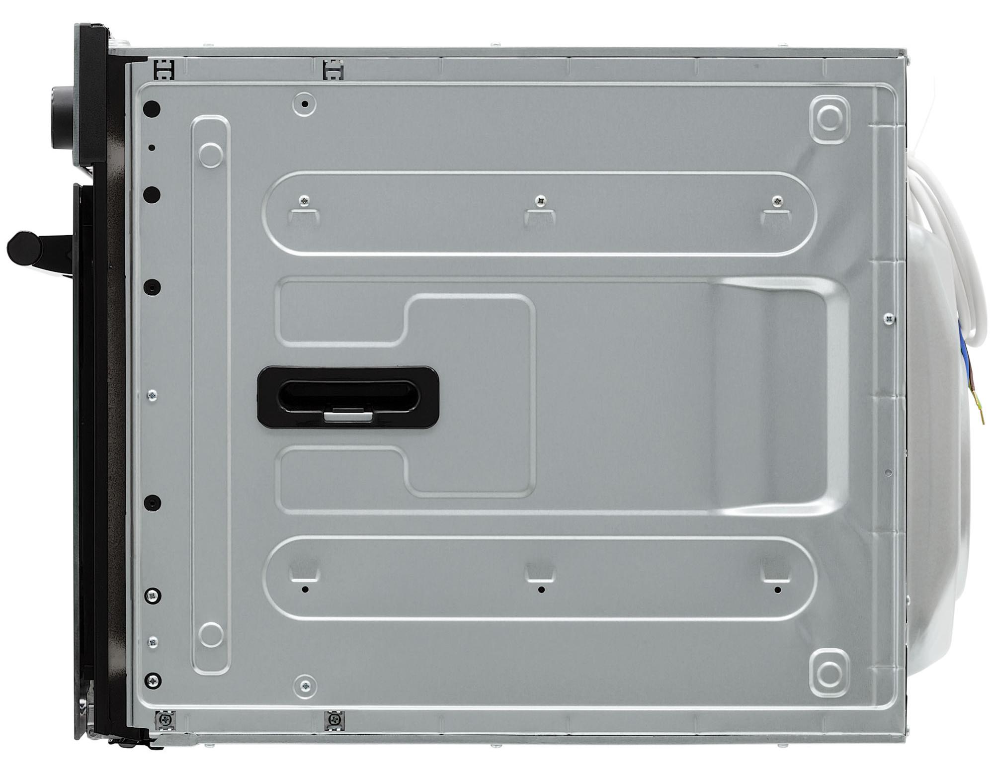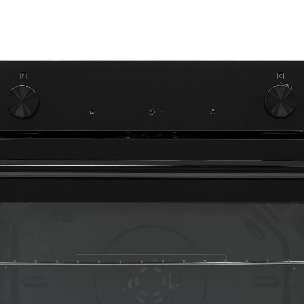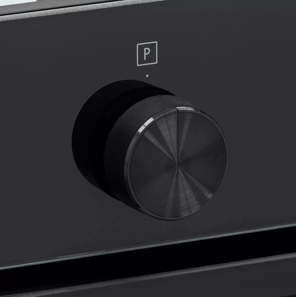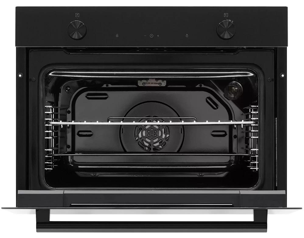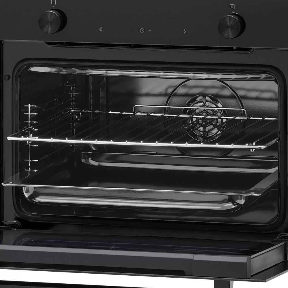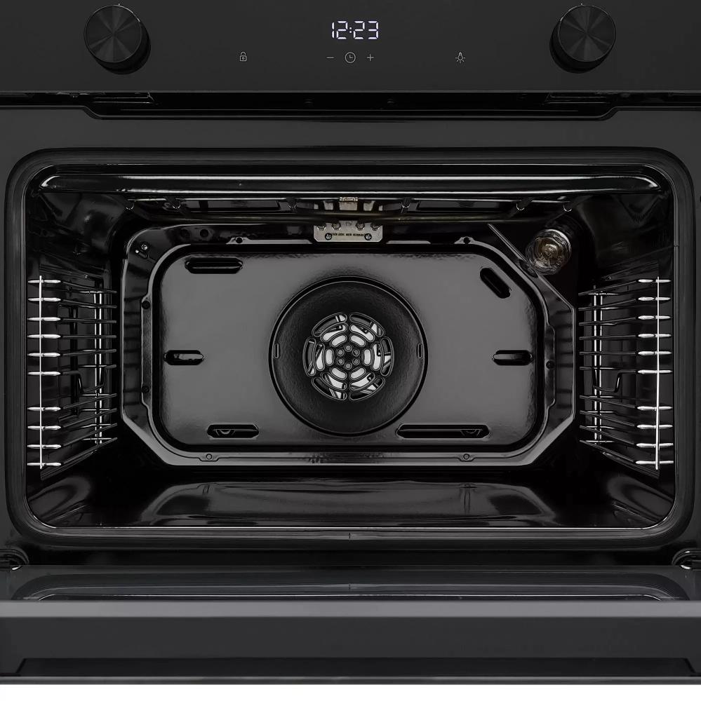 Дизайн сочетает минимализм и функциональность: откидная дверца с двумя стеклами сохраняет тепло и снижает температуру фасада. Черные ручки и вставки подчеркивают строгий внешний вид и не бросаются в глаза при ежедневном использовании. Внутренняя камера объемом 48 литров покрыта эмалью, что делает поверхность устойчивой к механическим повреждениям и облегчает уборку. Металлические направляющие на четырех уровнях обеспечивают надежную опору для противней и долговечность конструкции.