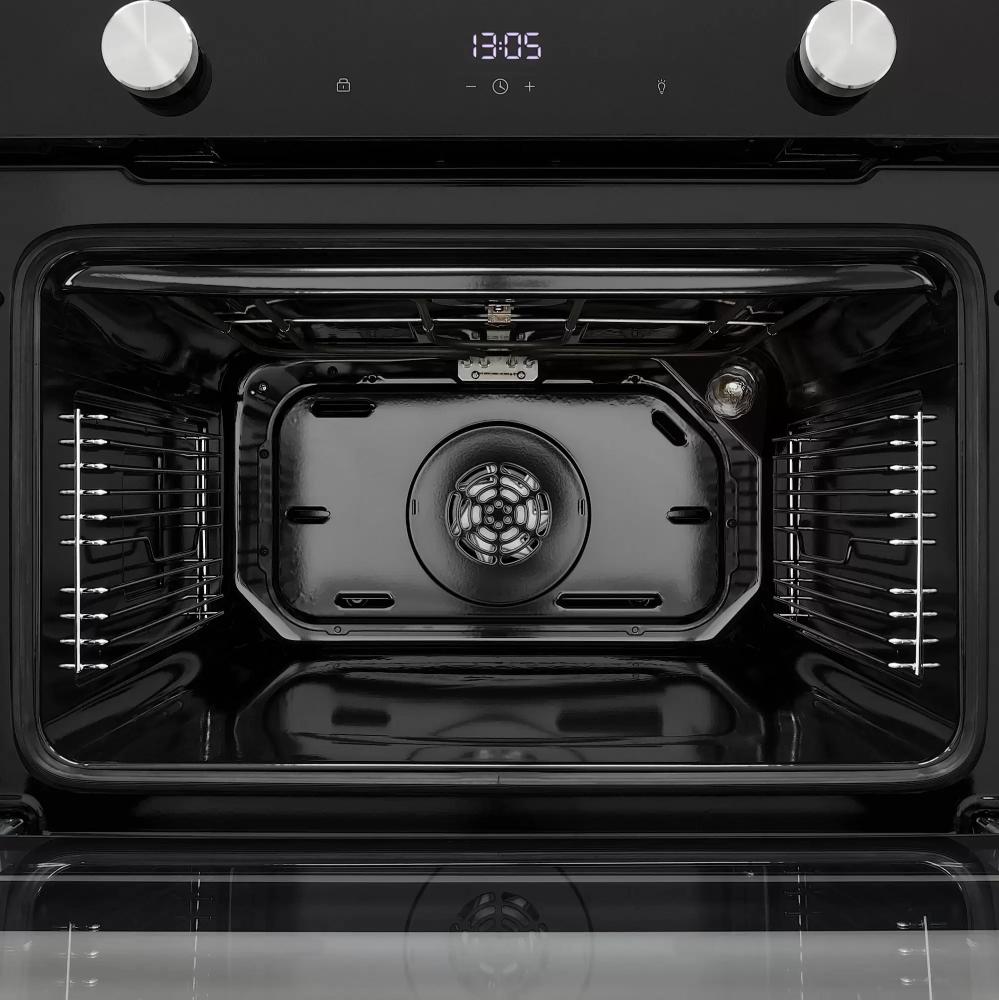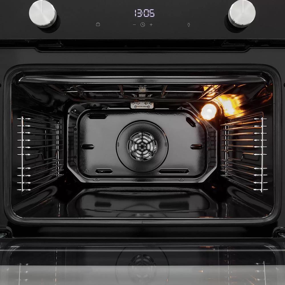 Особенности дизайна и внешней панели управления — также важный пункт при выборе духовки на кухню. В данной модели нужно обратить внимание на цвет — черный,