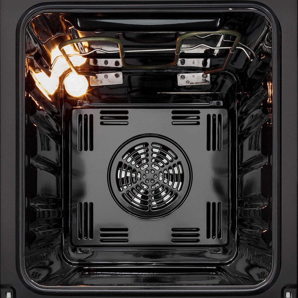 Нижний нагревательный элемент способствует быстрому повышению температуры воздуха в камере. В то же время начинает работать кольцевой нагревательный элемент на задней стенке камеры: расположенный внутри его контура вентилятор равномерно распространяет оба потока горячего воздуха по всему объему камеры. Таким образом, при размещении противня на третьем или втором уровне нижняя сторона блюда будет поджариваться за счет действия ТЭНа, а верхняя — запекаться под действием горячего воздуха, так что начинка всегда будет оставаться мягкой и сочной.