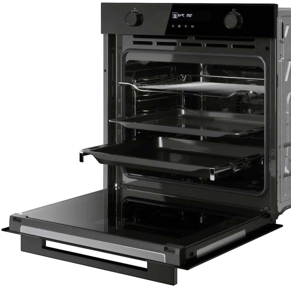 Особенности дизайна и внешней панели управления — также важный пункт при выборе духовки на кухню. В данной модели нужно обратить внимание на цвет — черный,
