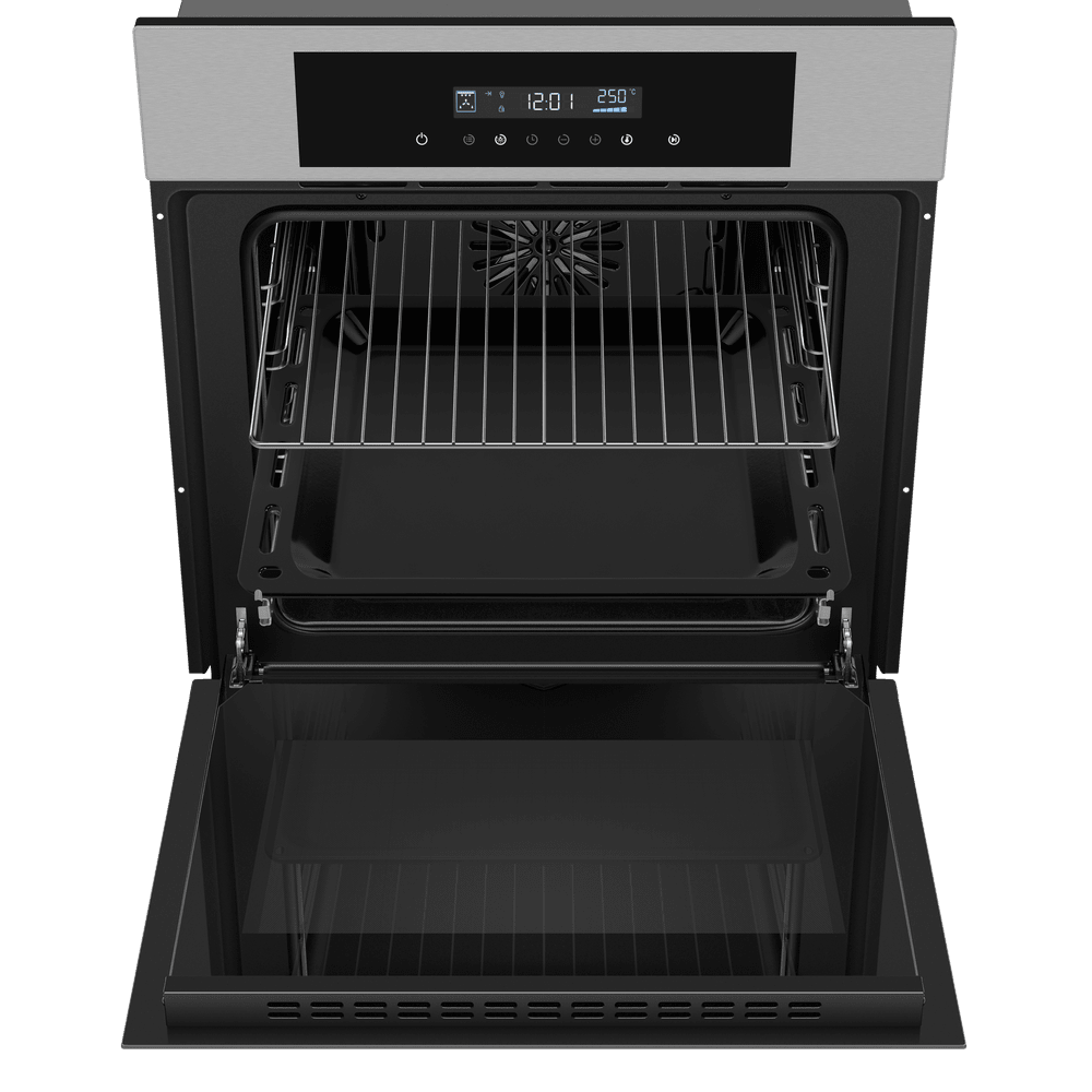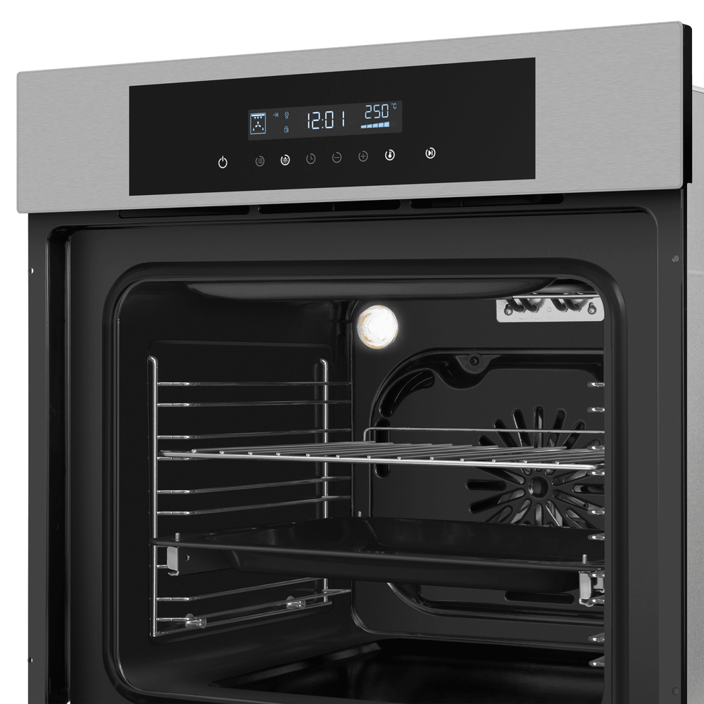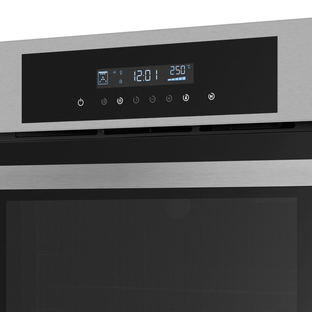 Особенности дизайна и внешней панели управления — также важный пункт при выборе духовки на кухню. В данной модели нужно обратить внимание на цвет — нержавеющая сталь,