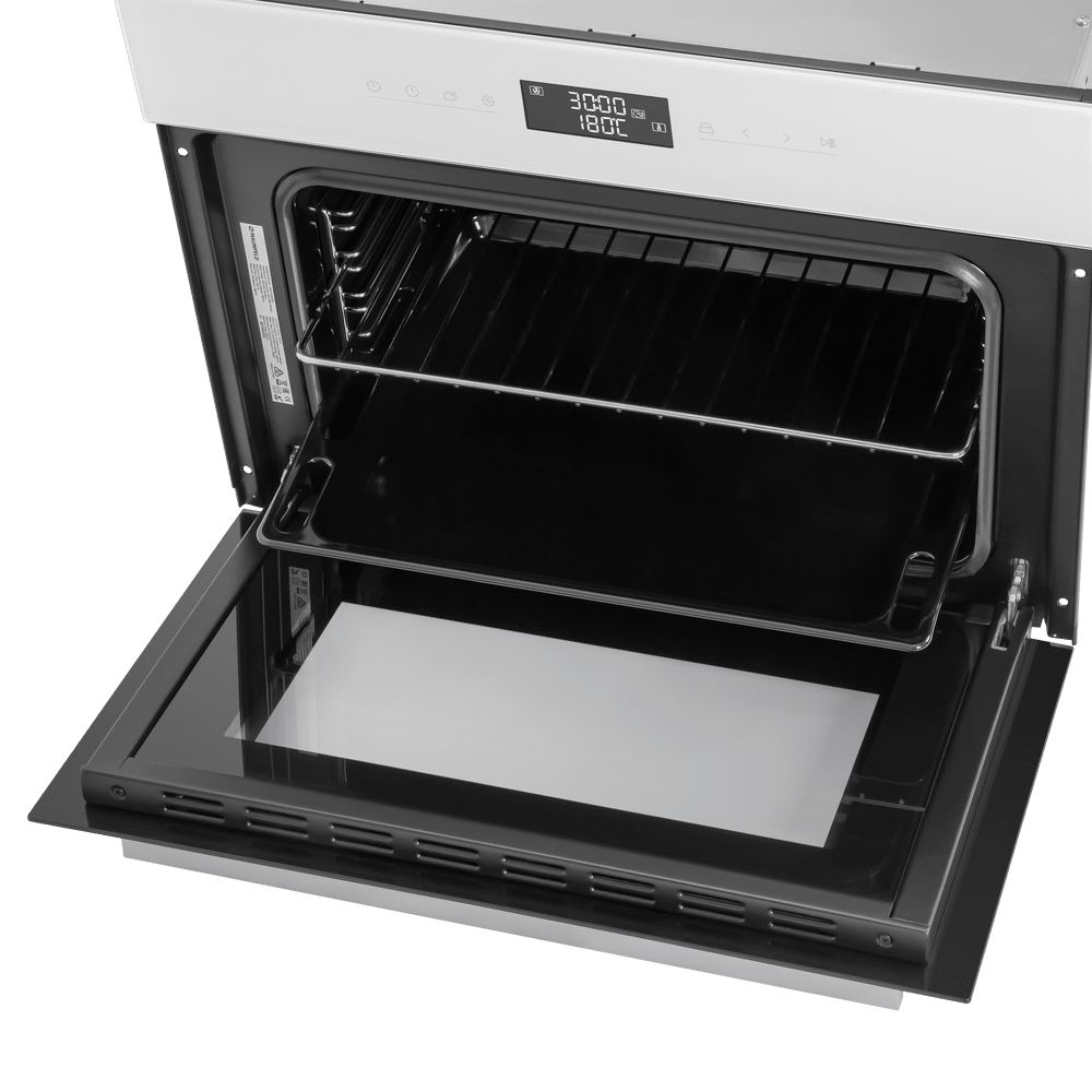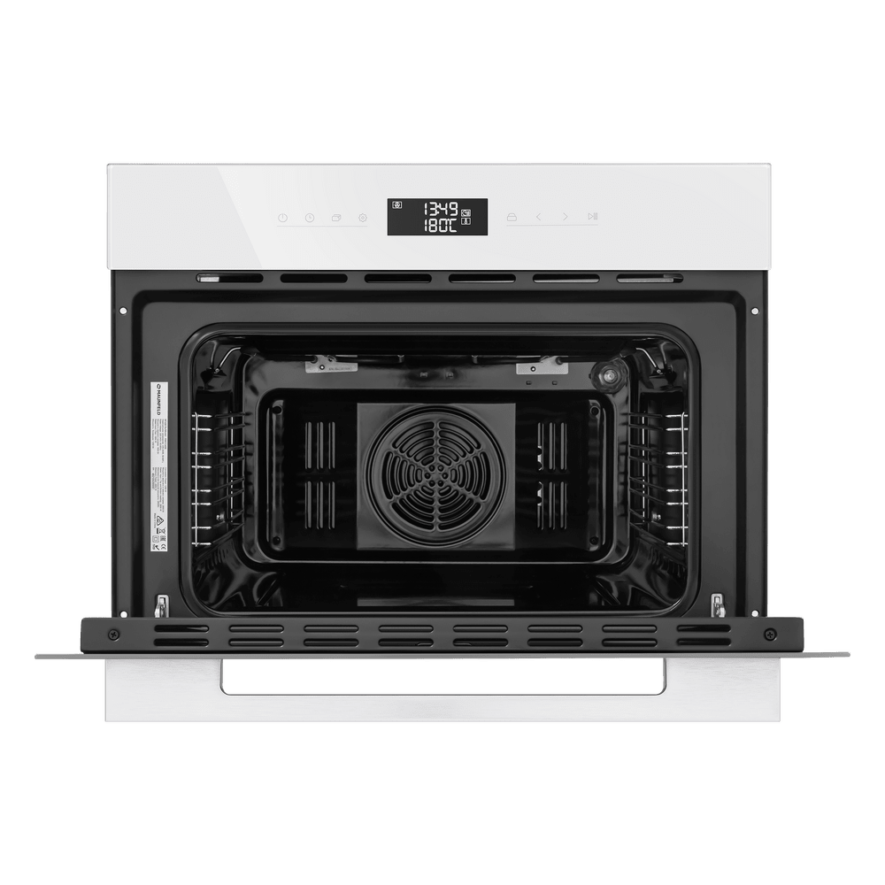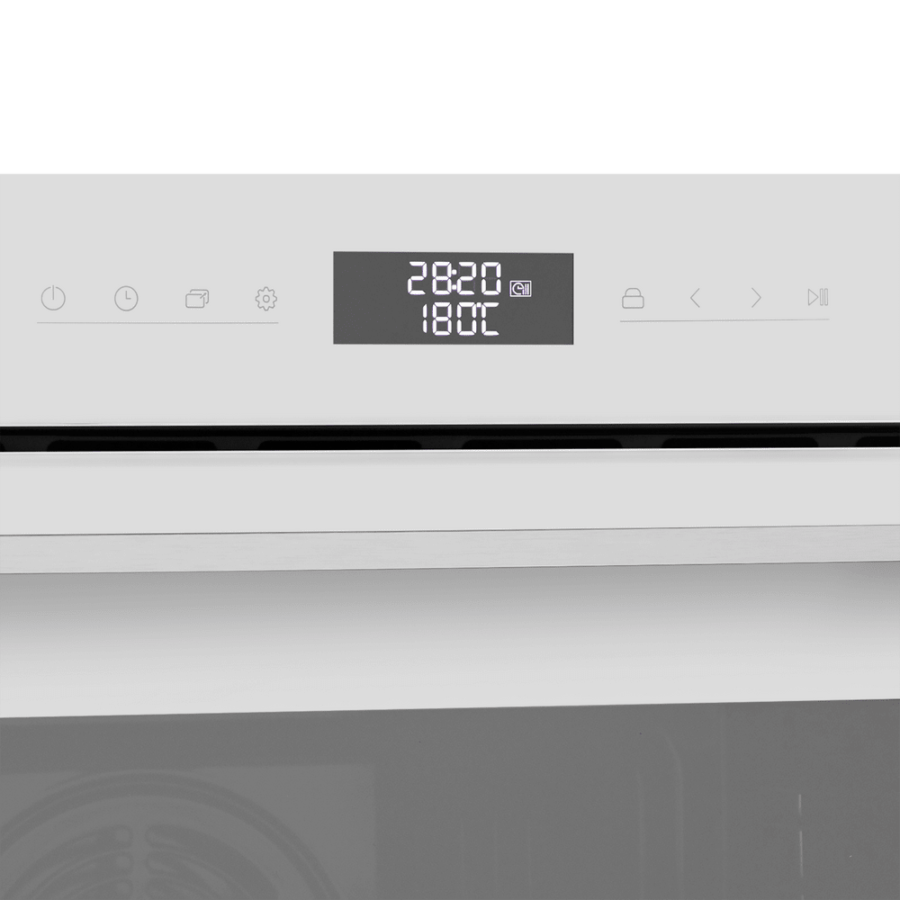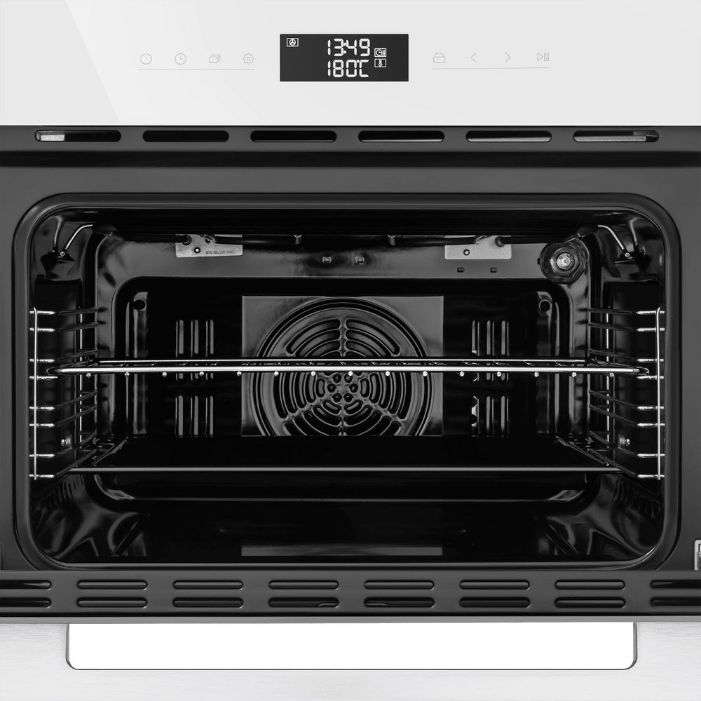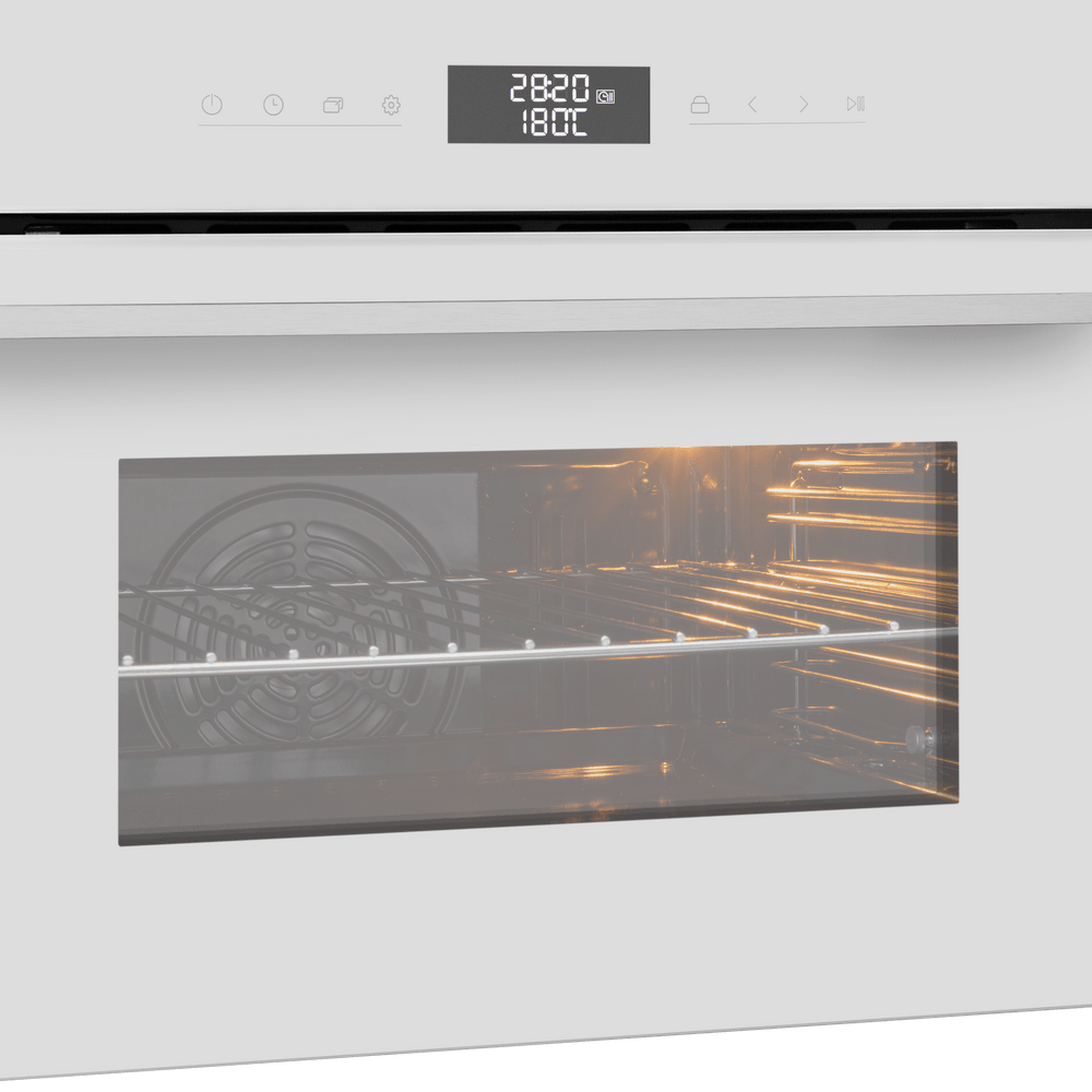 Особенности дизайна и внешней панели управления — также важный пункт при выборе духовки на кухню. В данной модели нужно обратить внимание на цвет — белый, охлаждение двери, чтобы поверхность и мебель вокруг не нагревались.