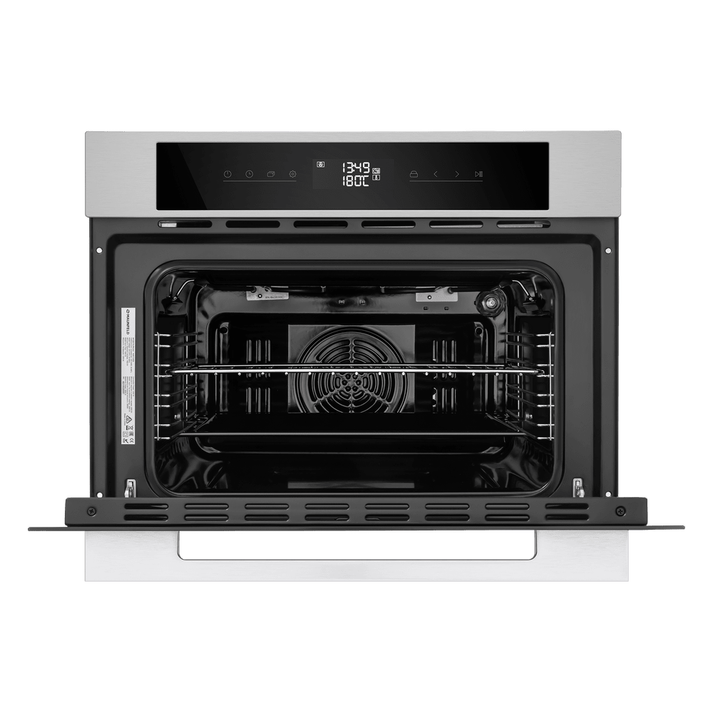 MAUNFELD AMCO458S — компактная независимая электрическая духовка с фасадом из нержавеющей стали. Удобная ручка-рейлинг также выполнена из стали, сенсорные кнопки и встроенный дисплей читаются ясно, а откидная дверца с тремя стеклами темного оттенка создаёт впечатление продуманной сборки и надёжной теплоизоляции.