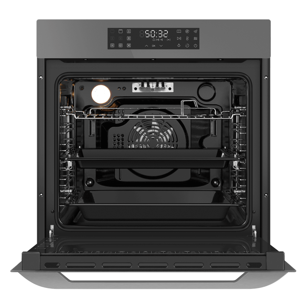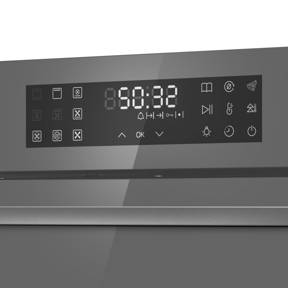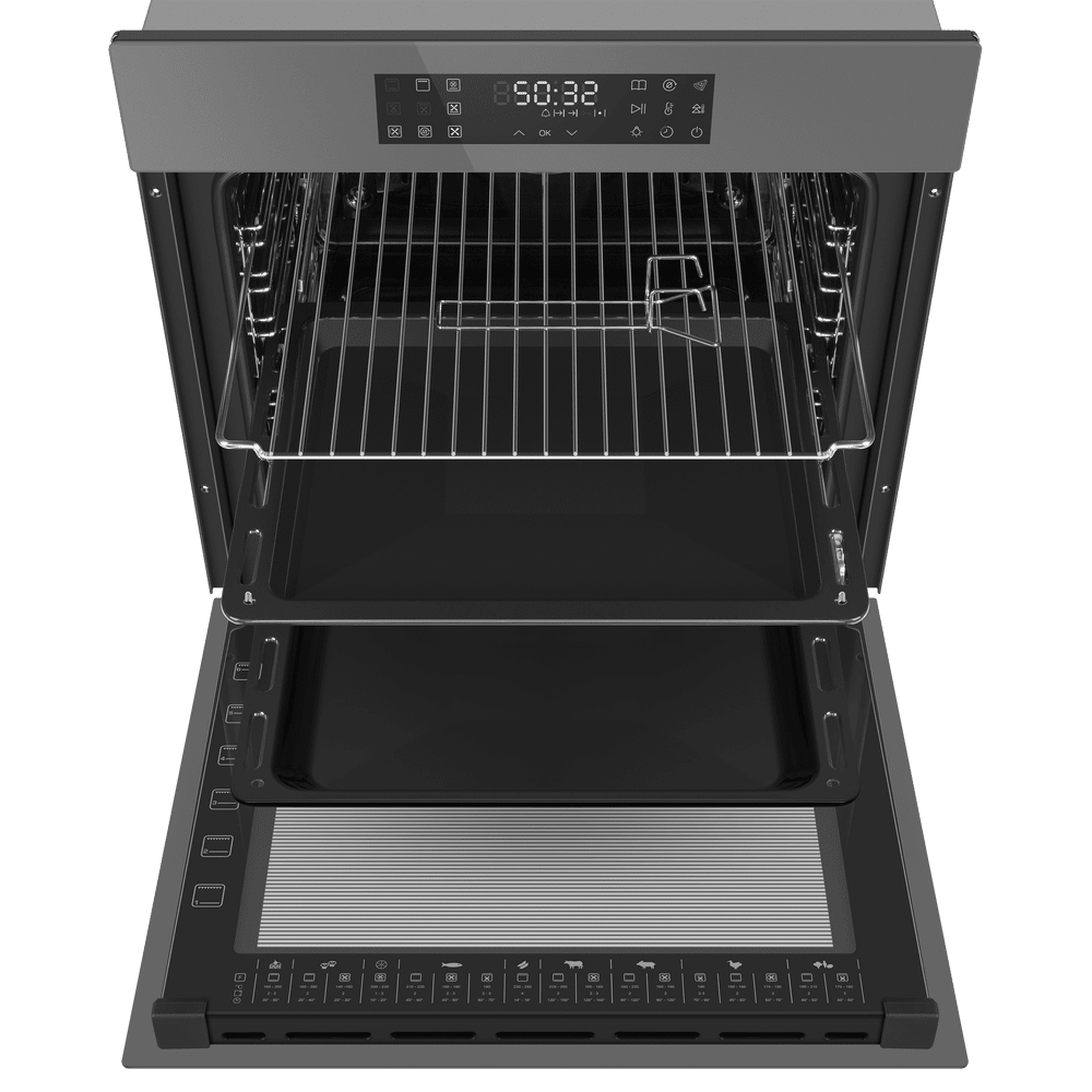 Элегантный корпус в сером цвете дополняет фурнитура из нержавеющей стали, создавая строгий, но впечатляющий образ. Откидная дверца со сложным многослойным остеклением включает три слоя и обеспечивает эффект холодной поверхности, что добавляет безопасности при использовании. Внутренняя часть покрыта эмалью лёгкой очистки, а подсветка делает контроль за приготовлением удобным и безопасным.