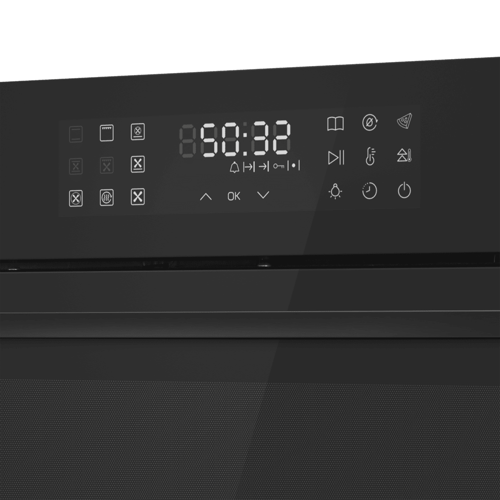 Особенности дизайна и внешней панели управления — также важный пункт при выборе духовки на кухню. В данной модели нужно обратить внимание на цвет — черный, охлаждение двери, чтобы поверхность и мебель вокруг не нагревались.