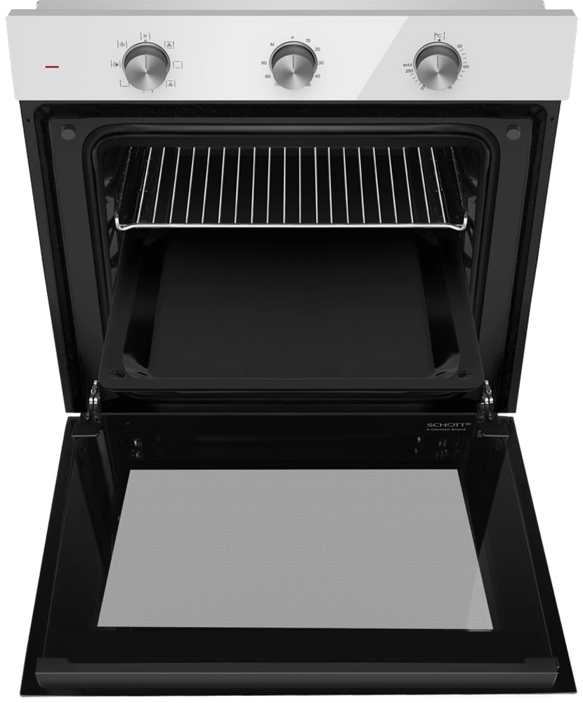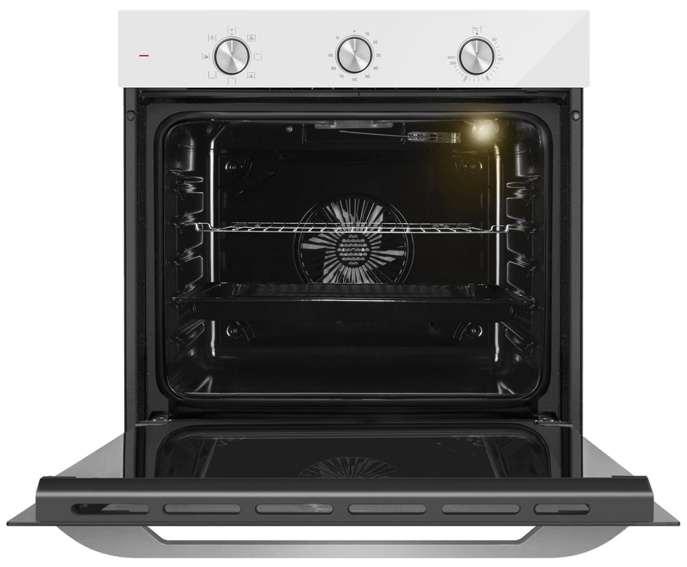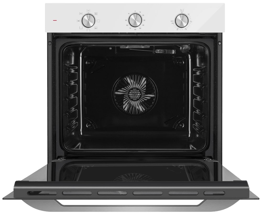 Белый независимый электрический духовой шкаф лаконичного дизайна с фурнитурой из нержавеющей стали органично впишется в светлые минималистичные кухни, а также дополнит классические интерьеры. Откидная дверца с тройным стеклом сохраняет тепло внутри и снижает температуру внешней панели. Внутреннее пространство объёмом 78 литров рассчитано на большие формы: их можно размещать на пяти уровнях приготовления. Управление механическое, на панели находятся три утапливаемых поворотных регулятора с понятными обозначениями температурных режимов и рабочих программ. Есть таймер и автоматическое отключение в конце приготовления для исключения перегрева и ущерба для техники. Внутренняя камера покрыта эмалью лёгкой очистки, с которой быстро удаляются пригоревшие жир и мусор. Ухаживать за поверхностью легче, если включена лампа подсветки. Комплектация включает решётку, противень и глубокий поддон — всё необходимое для выпечки, жарки и запекания. Доступны семь режимов работы: традиционный, раздельный верхний или нижний нагрев, конвекция, интенсивное жарение и конвекция с нижним нагревом, есть все необходимое для ежедневной готовки и ничего лишнего. Традиционная очистка упрощает обслуживание, а максимальная температура до 250 °C и класс энергопотребления A обеспечивают экономичное использование. Тангенциальное охлаждение и вентиляция защищают панели от перегрева, стандартные размеры, ширина и высота 60 см позволяют встраивать прибор в мебельную типовую нишу.