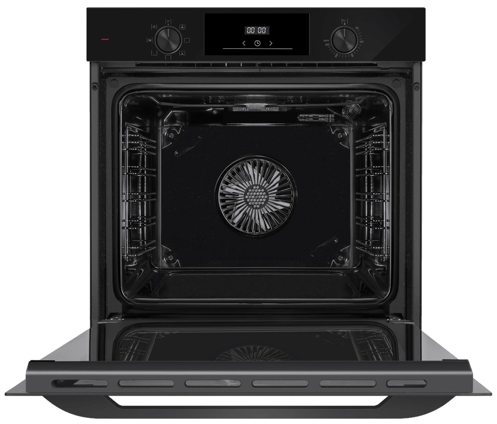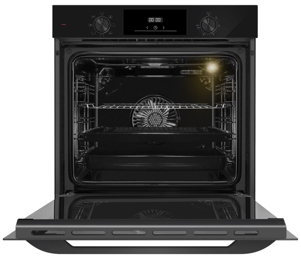 Особенности дизайна и внешней панели управления — также важный пункт при выборе духовки на кухню. В данной модели нужно обратить внимание на цвет — черный,