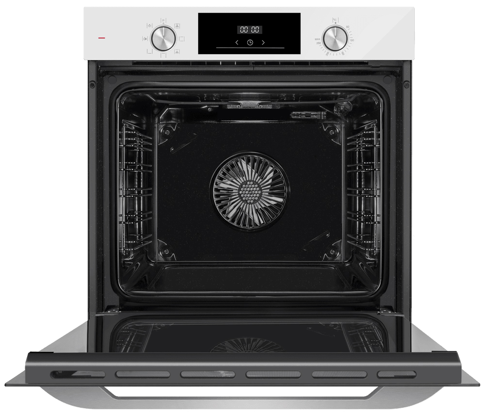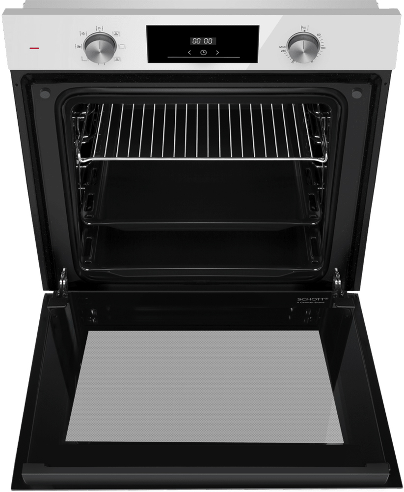 Фасад выполнен в светлом тоне, который легко согласуется с любыми кухонными поверхностями. Нейтральная цветовая гамма дополнена заметной фурнитурой из нержавеющей стали, а откидная дверца с тремя стеклами выглядит сдержанно и практично. Корпус формата 59.5×59.5×57 см встраивается в подготовленную нишу 59.5×56.8×55.5 см — размеры предсказуемые, поэтому монтаж без сюрпризов. Независимая конструкция позволяет располагать духовой шкаф там, где это удобнее по эргономике кухни, а не строго под варочной зоной.