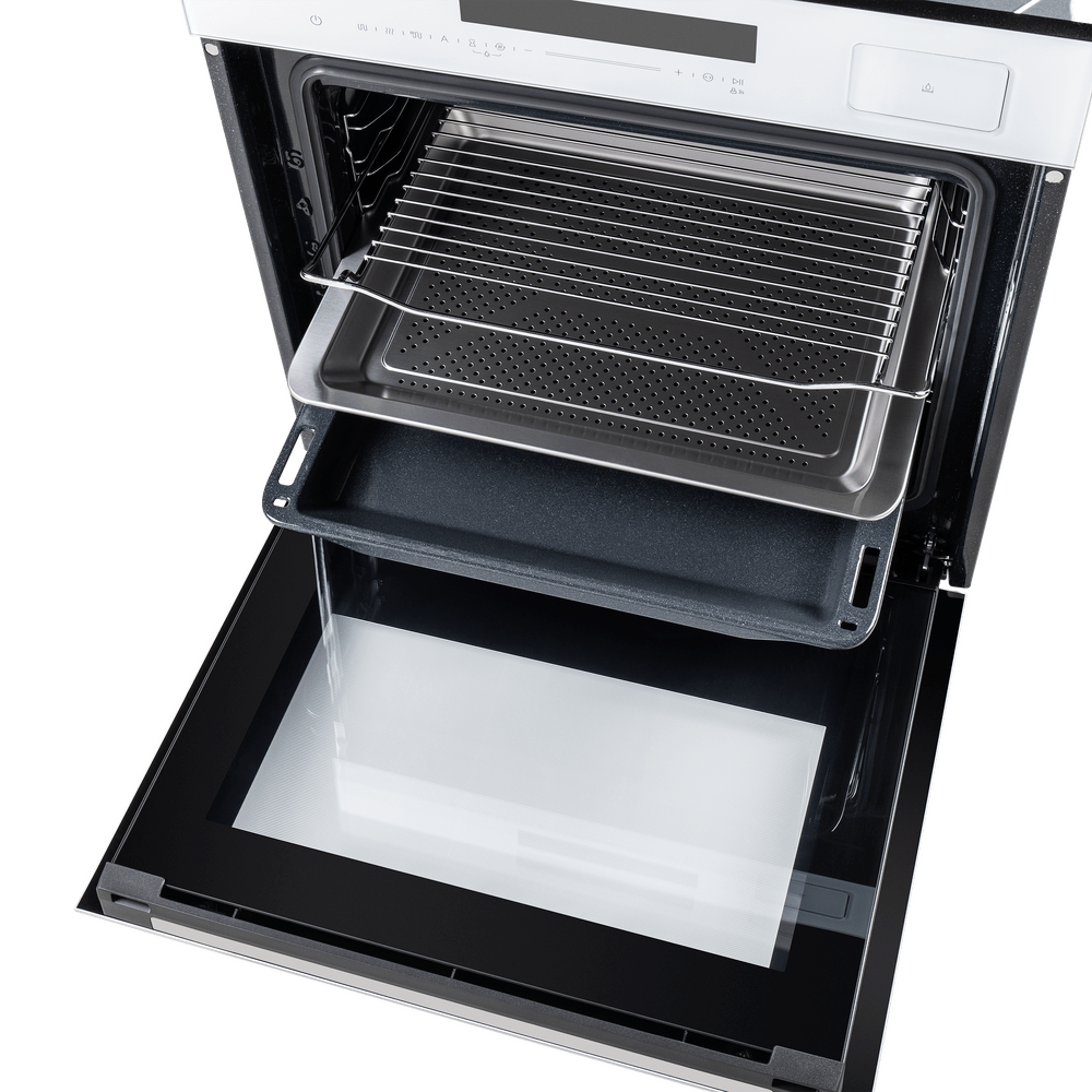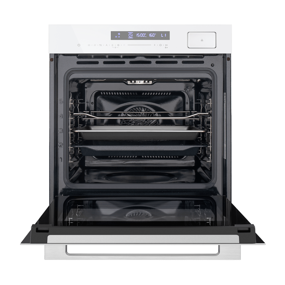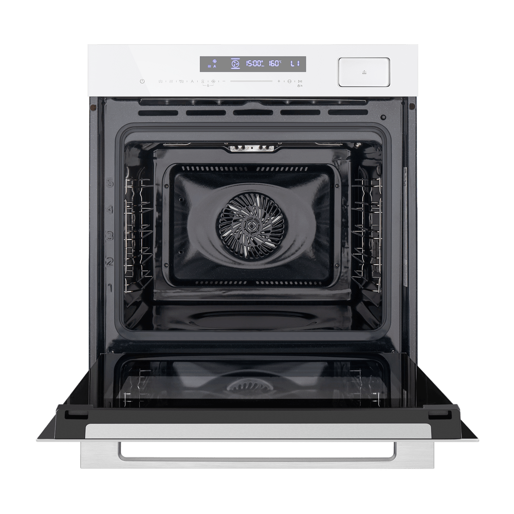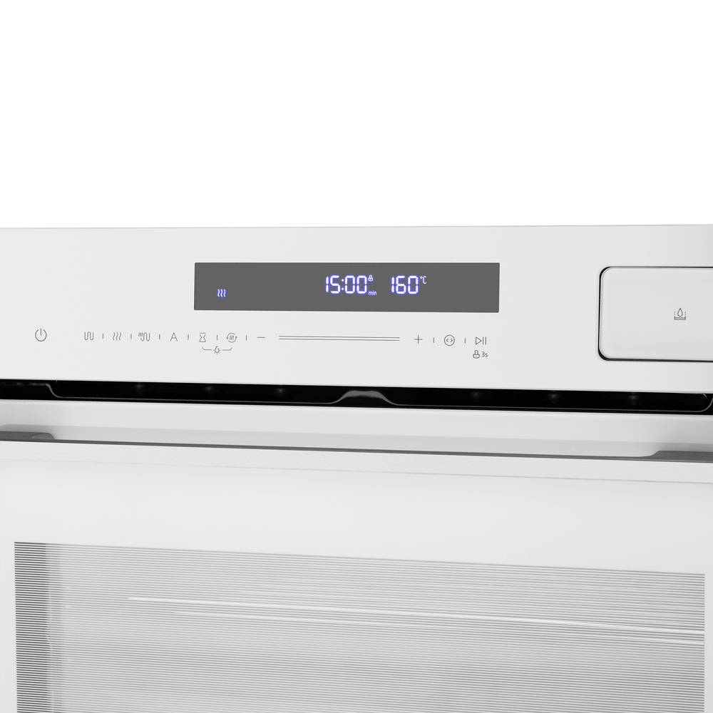 Особенности дизайна и внешней панели управления — также важный пункт при выборе духовки на кухню. В данной модели нужно обратить внимание на цвет — белый, охлаждение двери, чтобы поверхность и мебель вокруг не нагревались.