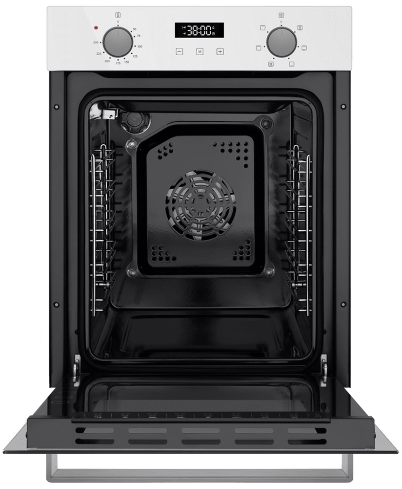 Особенности дизайна и внешней панели управления — также важный пункт при выборе духовки на кухню. В данной модели нужно обратить внимание на цвет — белый, охлаждение двери, чтобы поверхность и мебель вокруг не нагревались.