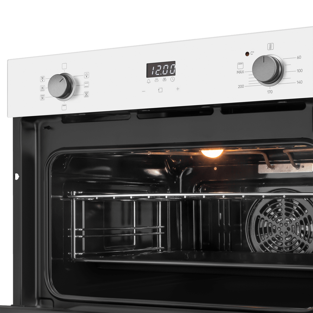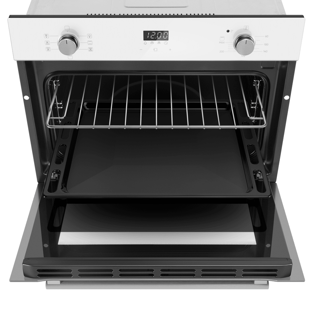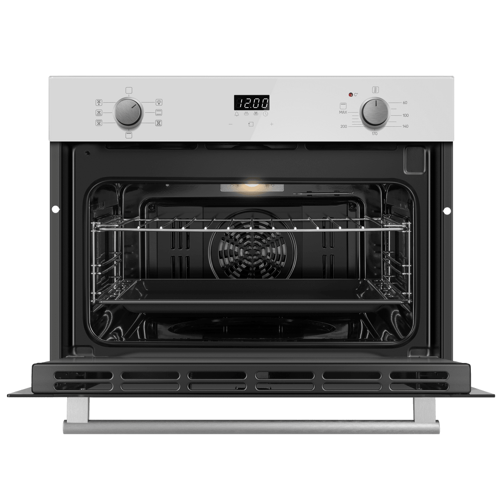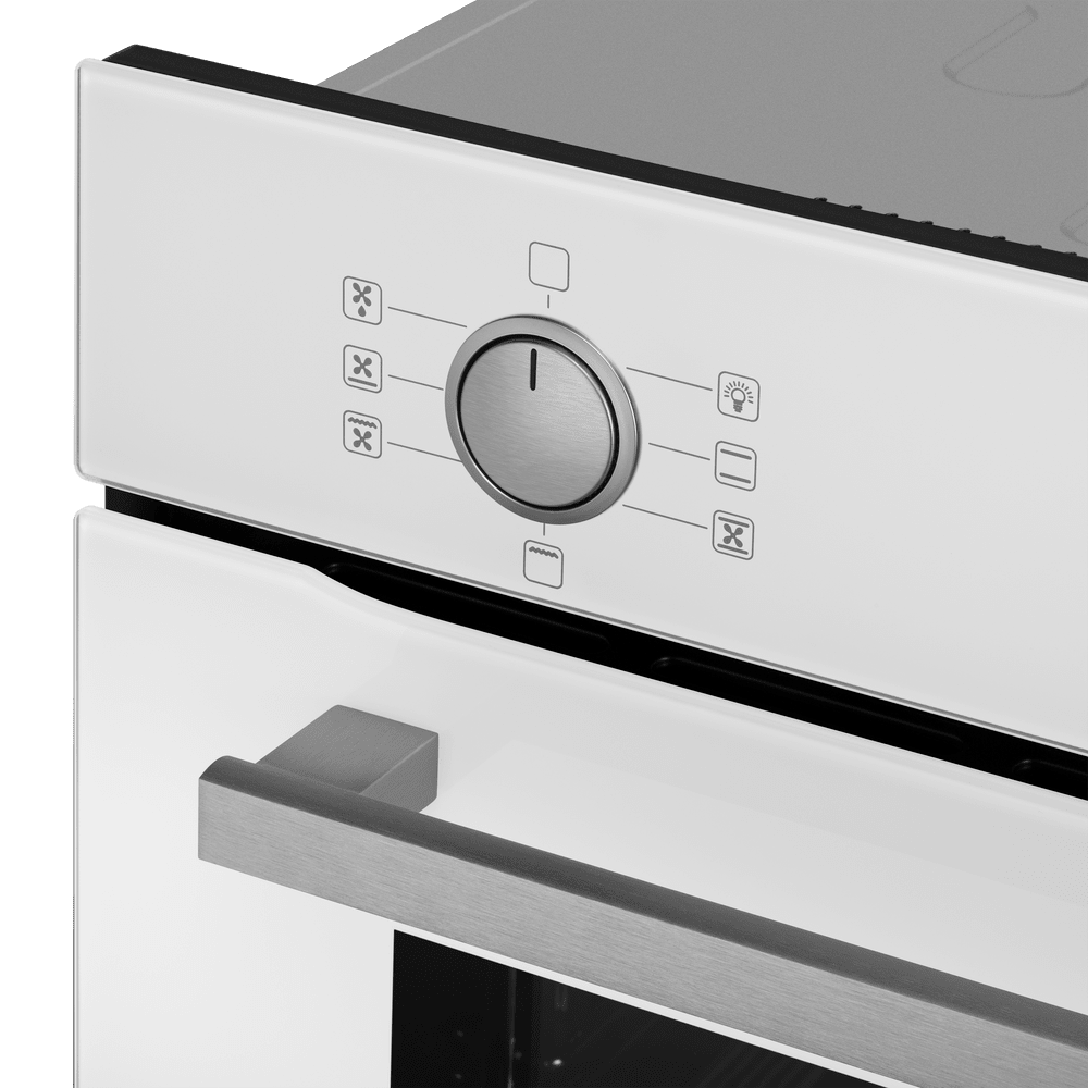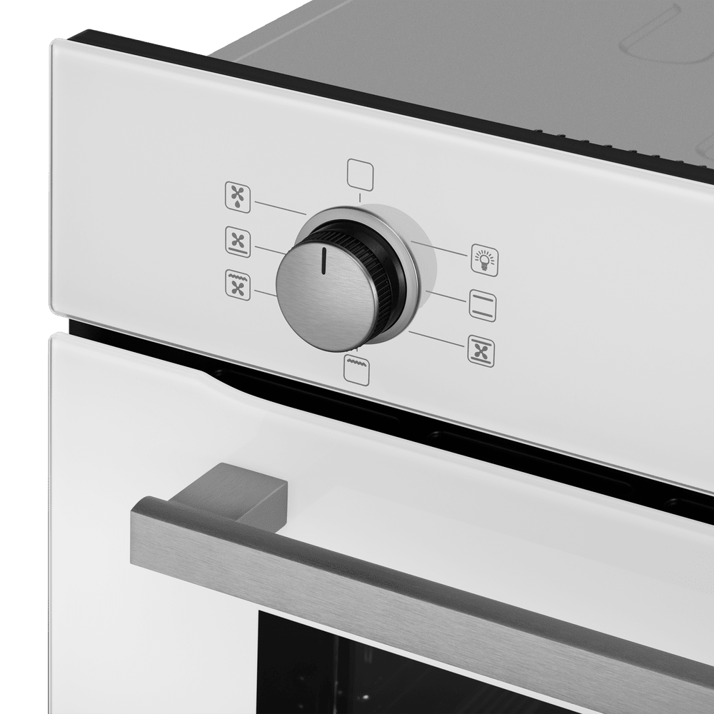 Особенности дизайна и внешней панели управления — также важный пункт при выборе духовки на кухню. В данной модели нужно обратить внимание на цвет — белый, охлаждение двери, чтобы поверхность и мебель вокруг не нагревались.