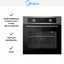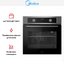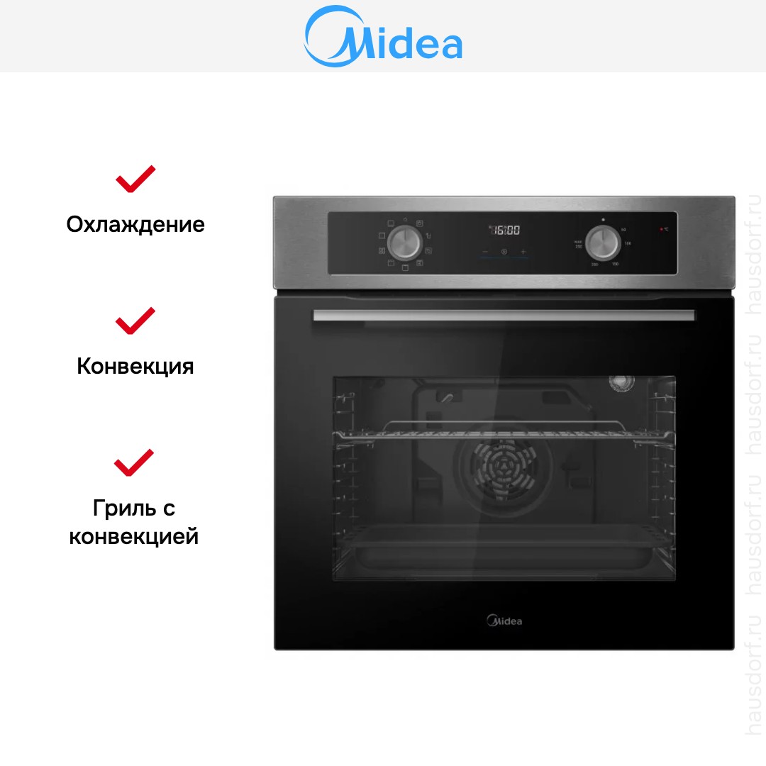 Духовой шкаф Midea MO509103X — независимый электрический прибор с корпусом из нержавеющей стали и аккуратными пропорциями 59,5×59,5×59,5 см. Встраивается в нишу стандартного размера 60×56×59 см и станет лаконичным акцентом в современном кухонном гарнитуре. Спереди — откидная дверца с двумя стеклами, которая хорошо удерживает тепло, а внутреннее освещение обеспечивает обзор без лишних открытий дверцы.