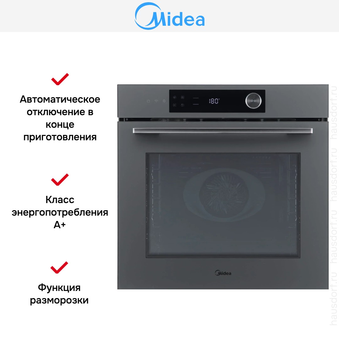 Количество режимов работы в духовом шкафу Мидеа: 13. В число доступных программ входят: классический нагрев, нижний нагрев, конвекция, гриль для создания хрустящей корочки, пицца, и другие. Помимо основных программ воспользуйтесь специальными возможностями этого прибора: размораживанием продуктов, чтобы сократить время на подготовку; поддержанием температуры в камере на определенном уровне, чтобы блюда не остывали; и другими. Тип гриля в этой модели — электрический.