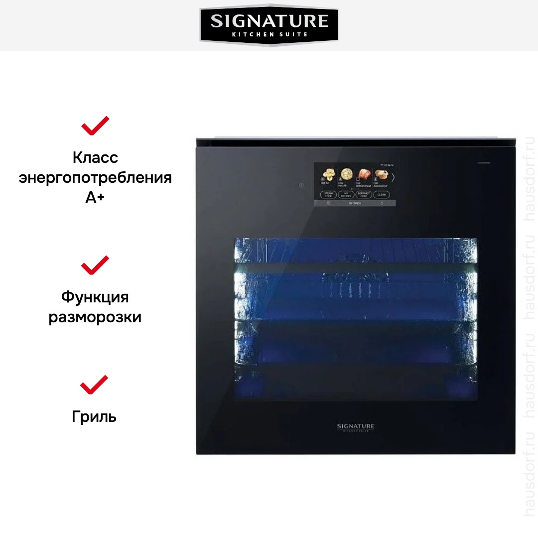 Встраиваемый электрический духовой шкаф Signature Kitchen Suite SKSOV2411S сочетает строгую черную отделку с цветным TFT-дисплеем и сенсорным управлением, что делает его стильным центром современной кухни. Корпус и фасад выдержаны в лаконичной эстетике, а отсутствие выступающей ручки и механизм автоматического открывания создают гладкую и минималистичную переднюю панель. Компактные внешние габариты 59.7×59.4×55.3 см позволяют встроить прибор в стандартную нишу 59.5×56×55.6 см, не теряя свободного пространства на кухне. Неброский дизайн легко сочетается с разными стилями интерьера, от хай‑тека до скандинавской кухни, при этом цвет и материалы корпуса устойчивы к отпечаткам и легко поддерживаются в чистоте.