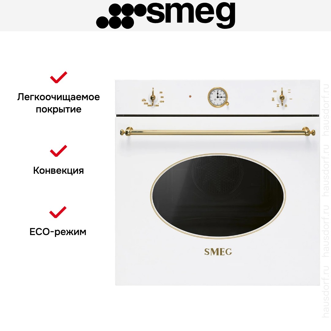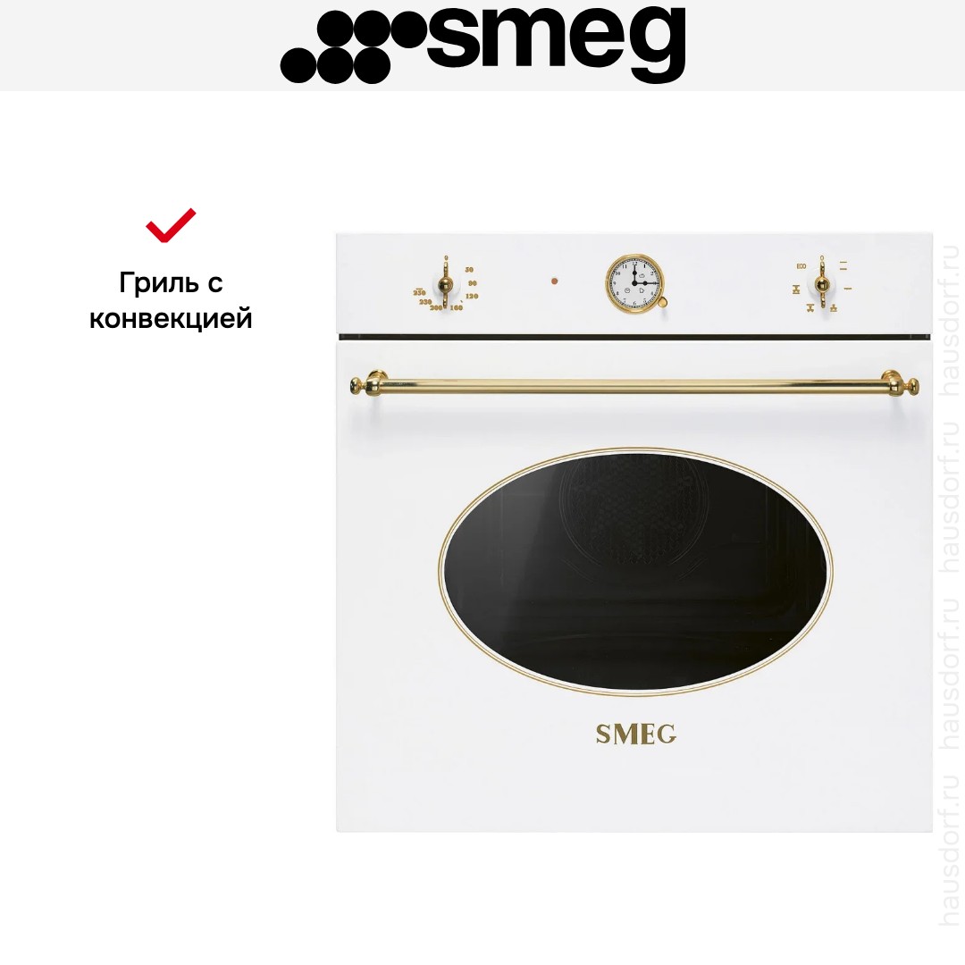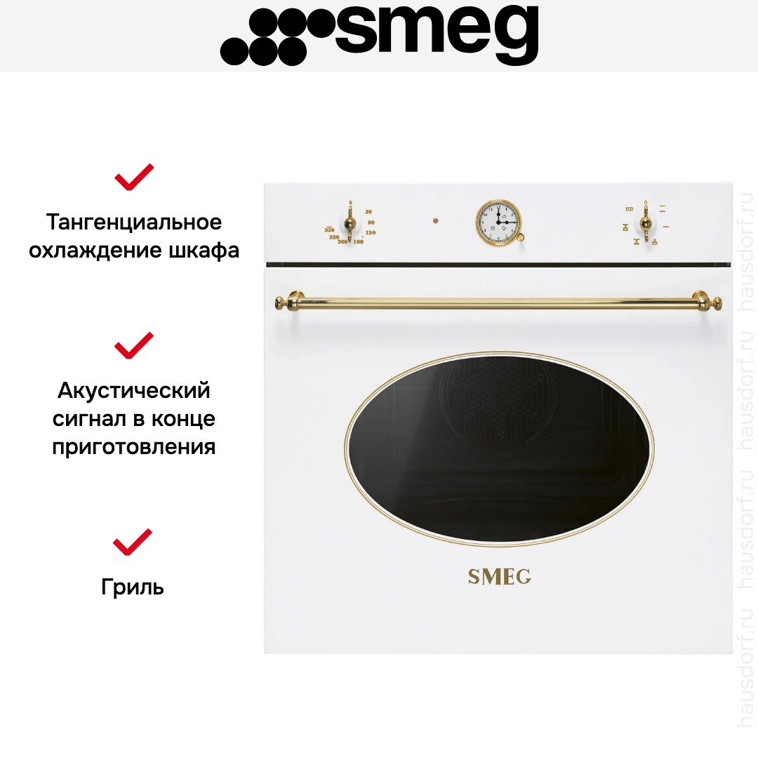 Духовой шкаф Smeg SF68C1B сочетает итальянскую элегантность и практичность в чистом белом цвете. Внешние элементы оформлены латунной фурнитурой, которая добавляет тепла и благородства. Откидная дверца с тремя стеклами обеспечивает безопасность и минимальные теплопотери. Размеры корпуса 59,2×59,7×57,1 см подходят для стандартной ниши, а указанные параметры встраивания помогут точно спланировать место установки.