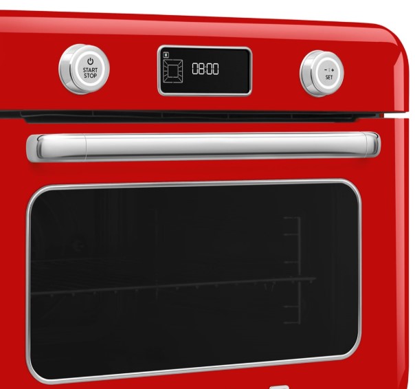 Особенности дизайна и внешней панели управления — также важный пункт при выборе духовки на кухню. В данной модели нужно обратить внимание на цвет — красный, Электронная панель управления позволяет быстро разобраться в настройке программ и не требует чрезмерных усилий.