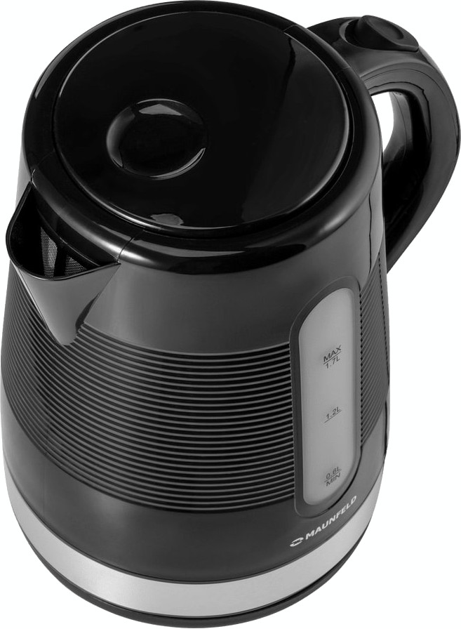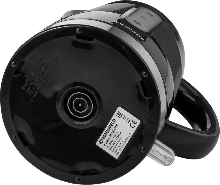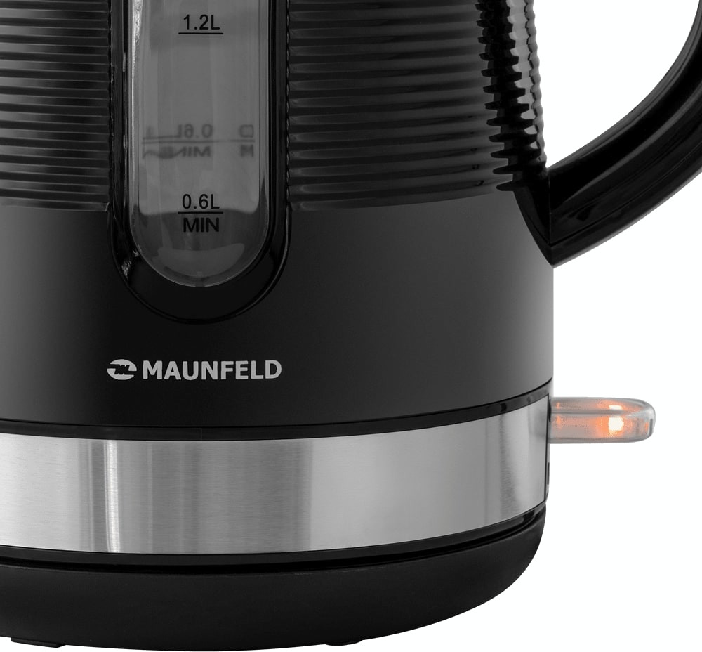 Электрочайник Maunfeld MGK-631B — компактный прибор с выразительным черным цветом и фактурной поверхностью корпуса.