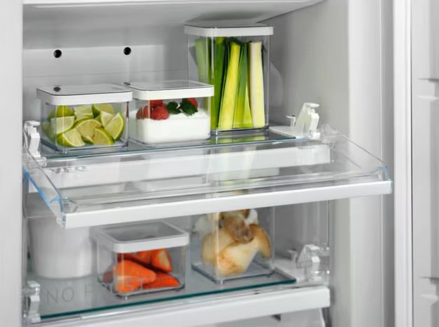 Ящики для продуктов изготавливаются либо целиком из прозрачного пластика, либо часто имеют переднюю прозрачную панель, которая обеспечивает лучший обзор. Полки в большинстве холодильников могут перемещаться по высоте, устанавливаются на специальных направляющих и без труда снимаются для очистки.