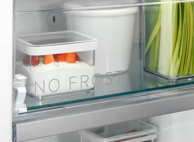 Образование льда предотвращает специальный вентилятор, который заставляет холодный воздух циркулировать по всему пространству морозильника. Лед при этом оседает не на стенках, а выводится за пределы камеры и остается на испарителе холодильника. Вентилятор работает попеременно с нагревателем, благодаря чему иней на испарителе оттаивает, а талая вода стекает в поддон, откуда испаряется естественным способом. Вопреки распространенному мнению, в морозильнике с системой No Frost продукты не заветриваются и не сохнут, а энергопотребление ненамного превышает этот показатель для обычных холодильников.