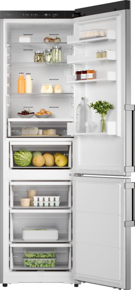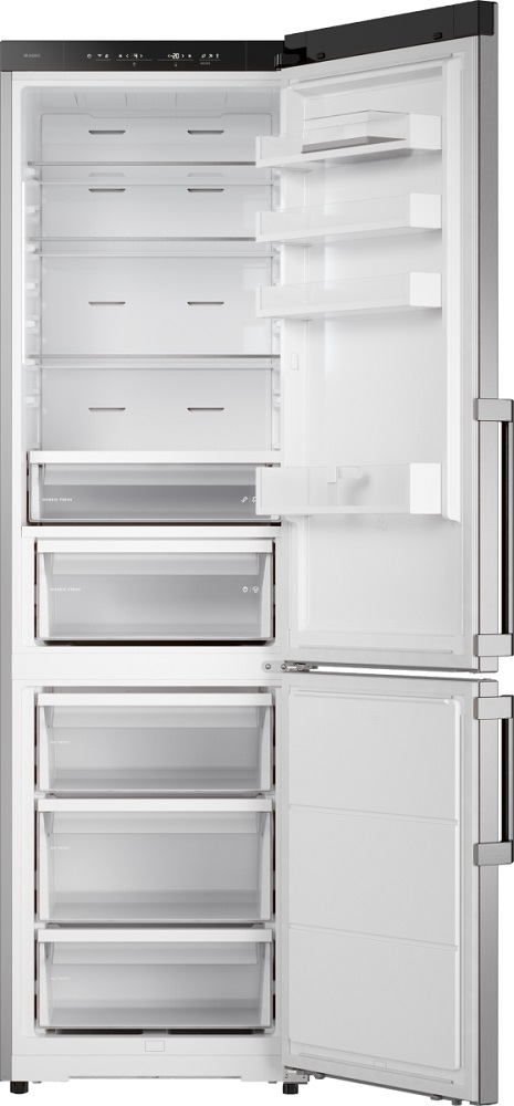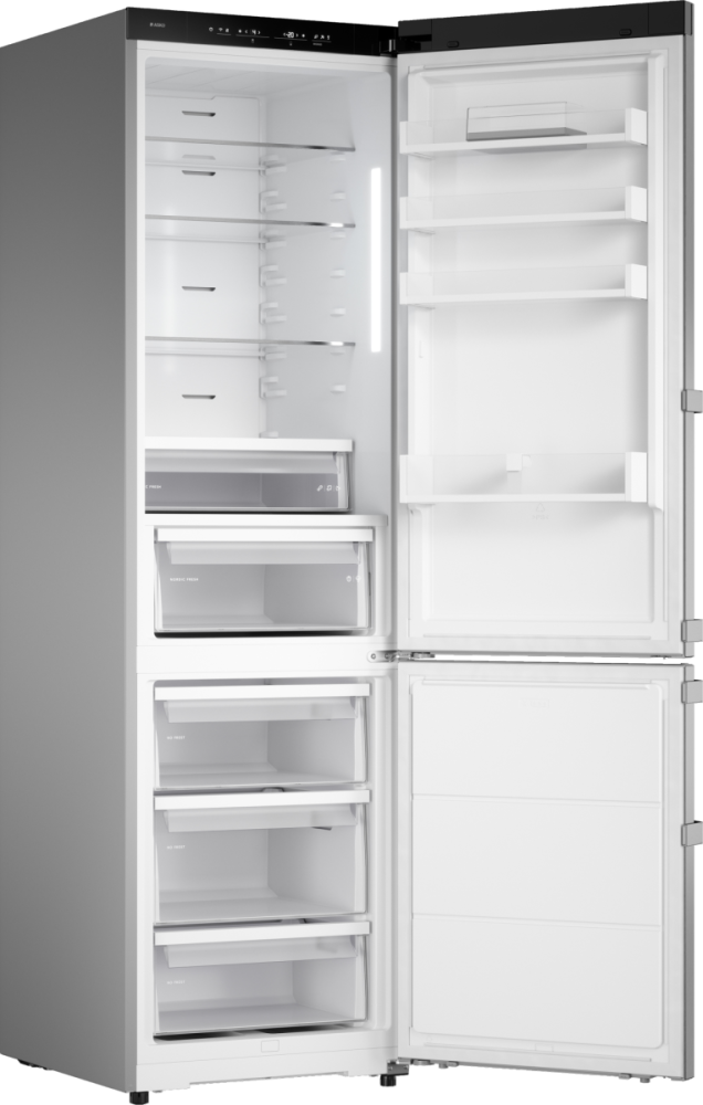 Холодильник ASKO RFC226RNBS1 представляет собой элегантное и функциональное решение для современной кухни, сочетающее строгий дизайн Series 2 в цвете нержавеющая сталь с продуманной эргономикой и богатыми возможностями хранения. При высоте 203 см, ширине 59 см и глубине 65 см этот отдельно стоящий агрегат аккуратно вписывается в стандартные ниши, при этом предлагает общий полезный объем 388 л, включая 267 л в холодильной части и 121 л в морозильной секции, расположенной снизу. Верхняя зона оснащена тремя прочными стеклянными полками и четырьмя полками на дверце, есть подставка для яиц, а также специальная фреш-зона Nordic Fresh с двумя контейнерами для длительного сохранения продуктов. Для удобства предусмотрена полка для бутылок и телескопические направляющие, облегчающие доступ к продуктам. Морозильная область с системой No Frost разделена на три ящика и дополнена лотком для льда; её производительность составляет 13 кг/сутки, а автономность при отключении питания достигает 13 часов, благодаря продуманной циркуляционной схеме охлаждения и инверторному компрессору на базе хладагента R600A. Электронное управление реализовано через сенсорные кнопки и информативный LED‑дисплей; прибор предлагает адаптивный температурный контроль, режимы суперохлаждения и суперзамораживания, а также специализированные режимы Шаббат, Вечеринка и режим очистки, которые делают эксплуатацию гибкой и комфортной. Управлять настройками можно дистанционно с помощью приложения ConnectLife.TRIR, что упрощает контроль микроклимата и позволяет отслеживать состояние через смартфон. Внутреннее освещение выполнено светодиодами, обеспечивающими яркую и равномерную подсветку, а антибактериальное покрытие защищает поверхности от нежелательной микрофлоры. Конструкция допускает перевешивание дверей и оснащена регулируемыми ножками, обеспечивая простоту установки даже на неровной поверхности; дверной упор — справа. Уровень шума на рабочем режиме составляет всего 34 дБ, поэтому агрегат практически не отвлекает, а класс энергоэффективности A++ и годовой расход 197 кВт·ч гарантируют экономичную эксплуатацию. Для безопасности пользователя предусмотрена звуковая индикация открытой двери и световая со звуковой сигнализацией при повышении температуры; также аппарат поддерживает контроль уровня влажности, что особенно важно для сохранения структуры и вкуса свежих продуктов. Материалы отделки и комплектующие продуманы для активной эксплуатации: стеклянные полки устойчивы к нагрузкам, ящики морозильника надежно организуют пространство, а ручка с гравировкой бренда придает внешнему виду премиальный штрих. Этот прибор объединяет вместительность и технологии, предлагая стабильный режим работы благодаря одному инверторному компрессору и эффективной циркуляционной системе охлаждения; длина сетевого шнура 3 м и напряжение 220-240 В при частоте 50-60 Гц обеспечивают совместимость с бытовой сетью в большинстве жилых помещений. Вес нетто 69,5 кг делает установку возможной, а упаковочные габариты учитывают безопасную доставку. В сумме устройство предоставляет продуманные опции для хранения разных категорий продуктов, надежную работу в различных климатических классах SN‑N‑ST‑T и удобный пользовательский интерфейс, что делает его привлекательным вариантом для тех, кто ценит сочетание стил