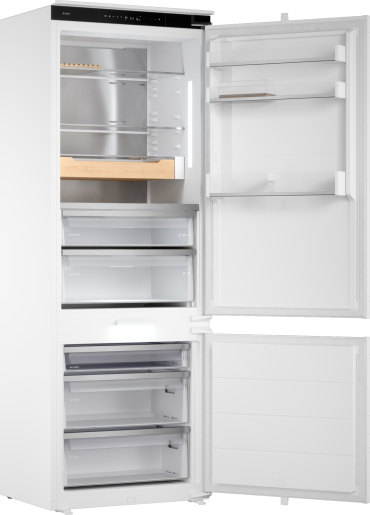 Встраиваемый комбинированный холодильник ASKO RBC597SND1 обладает выраженным скандинавским характером: строгие линии, минималистичная фронтальная поверхность под навес вашего фасада и утончённые аксессуары из ясеня с масляной пропиткой придают интерьеру премиальную нотку, а гравированная ручка аккуратно подчёркивает принадлежность к Series 5. При высоте 193.6 см, ширине 69 см и глубине 54.4 см прибор легко прячется в нишу размером 194—194.5×71—72×56 см, оставляя по периметру достаточно места для циркуляции воздуха и обеспечения эффективного охлаждения. Конструкция с нижней морозильной камерой рассчитана на удобный доступ к часто используемым продуктам: общий объём составляет 370 л при полезной ёмкости холодильного отделения 104 л, внутри — ровно четыре стеклянных полки, три полки на дверце, держатель для яиц и зона свежести DuraFresh™ с двумя контейнерами и собственной светодиодной подсветкой, позволяющая поддерживать оптимальную влажность и продлевать срок хранения овощей, зелени и деликатных продуктов. Управление полностью электронное: сенсорные кнопки, TFT-дисплей и тактильная обратная связь обеспечивают интуитивное взаимодействие, есть интеграция с приложением ConnectLife для дистанционного мониторинга и корректировки параметров, а адаптивный температурный контроль автоматически подстраивает режимы под загруженность камеры. Функции суперохлаждения и суперзамораживания пригодятся при быстром снижении температуры после загрузки большого количества свежих ингредиентов; морозильная секция No Frost, устройство производительностью 6 кг/сутки и три вместительных ящика дают возможности для долгого хранения, а лоток для льда и внутренняя LED-подсветка упрощают повседневное использование. Технологическая составляющая включает один инверторный компрессор, экологичный хладагент R600A и циркуляционную систему охлаждения для равномерного распределения холодного воздуха, при этом класс энергопотребления D и годовой расход около 235.68 кВт·ч обеспечивают баланс между экономичностью и производительностью. Отдельные режимы — Шаббат, Вечеринка, Ночной и режим очистки — расширяют сценарии использования: можно быстро подготовить прибор к приёму гостей, снизить уровень шума в ночное время или провести санитарную обработку без лишних манипуляций. Безопасность и удобство поддерживаются сигнализацией открытой двери, звуковыми и световыми предупреждениями о повышении температуры, сохранением настроек при отключении электричества и возможностью перевешивания дверей благодаря скользящему монтажу door sliding. Внутренние решения дополняют полка для бутылок и телескопические направляющие, задняя стенка выполнена из нержавеющей стали AISI 304, что облегчает уход и повышает долговечность, а уровень шума в рабочем режиме не превышает 35 дБ, что делает агрегат практически бесшумным в бытовой среде. Монтаж и подключение просты: питание 220-240 В, 50-60 Гц, длина шнура 3 м и мощность подключения 235 Вт, при этом габариты упаковки 200.5×74.5×59 см и масса нетто 96 кг позволяют планировать логистику установки. Этот встроенный прибор сочетает премиальные материалы, продуманные функциональные опции и умные технологии, создавая надёжную, комфортную и эстетичную базу для современной кухни.