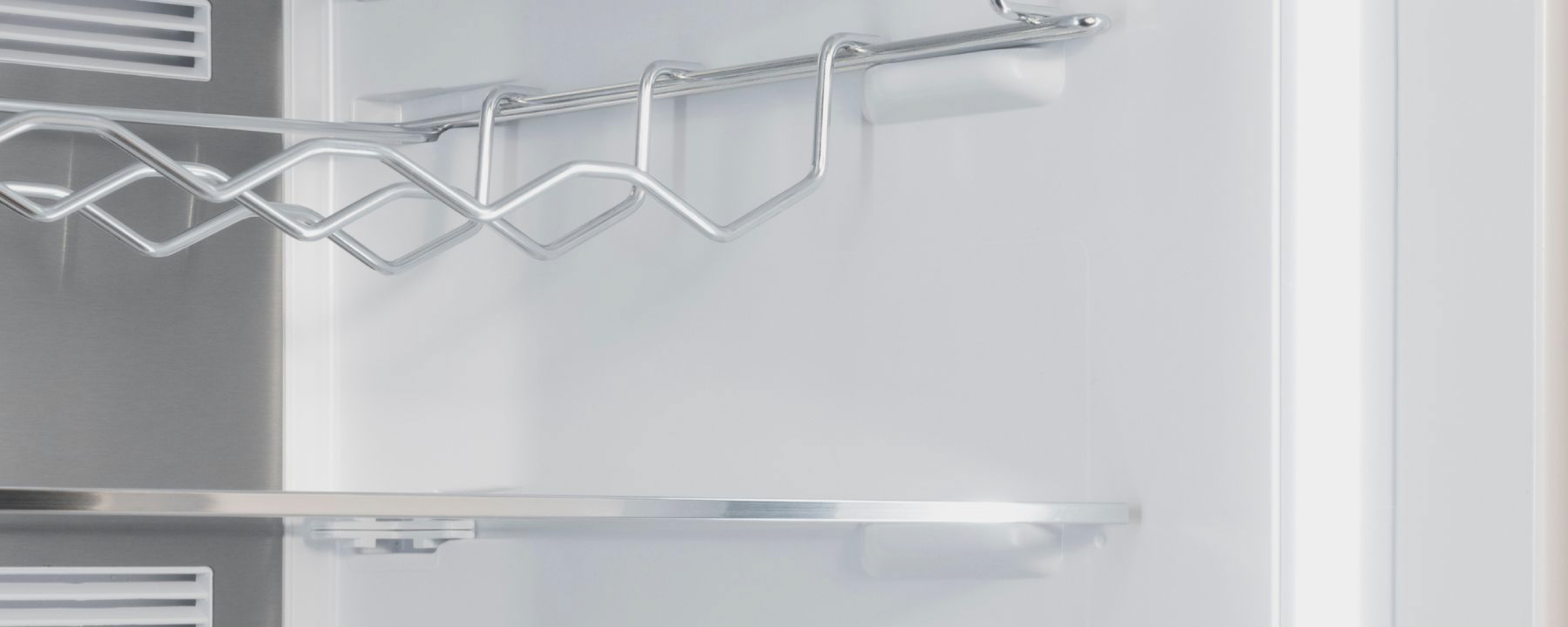 Для стеклянных бутылок, особенно винных и содержащих другие алкогольные напитки, предусматривается размещение на подвесной решетчатой металлической полке. Бутылки на ней располагаются в горизонтальном положении — это оптимальный способ хранения вин. Съемная металлическая полка легко моется под краном.