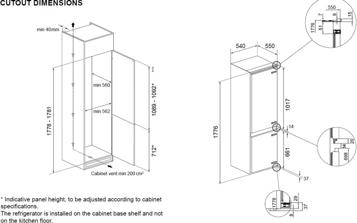 Встраиваемые холодильники монтируются в нишу или колонну. Передняя их часть закрывается декоративным мебельным фасадом и снаружи не отличается от дверцы обычного кухонного шкафа, так что их не нужно подбирать под интерьер помещения. Объем этих холодильников, как правило, несколько меньше, чем у отдельностоящих, так как при встраивании необходимо оставлять свободное пространство для вентиляции. Они отличаются меньшим уровнем шума, а также лучше держат холод и отличаются большей экономичностью из-за дополнительного слоя изоляции. Ассортимент этих холодильников не так велик, как у отдельно стоящих, установка более трудоемкая, а стоимость обычно несколько выше.