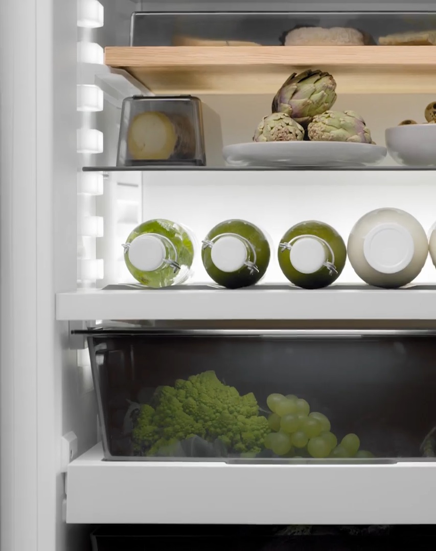 Нередко зона свежести состоит из нескольких ящиков с разным уровнем влажности. Продукты с высоким содержанием влаги — например, овощи или фрукты, хранятся при влажности воздуха около 85-90%, а такие продукты, как мясо, рыба или сыр, требуют пониженной влажности около 50-60%. У большинства моделей при загрузке и извлечении продуктов из зоны свежести приходится пользоваться общим освещением холодильной камеры.